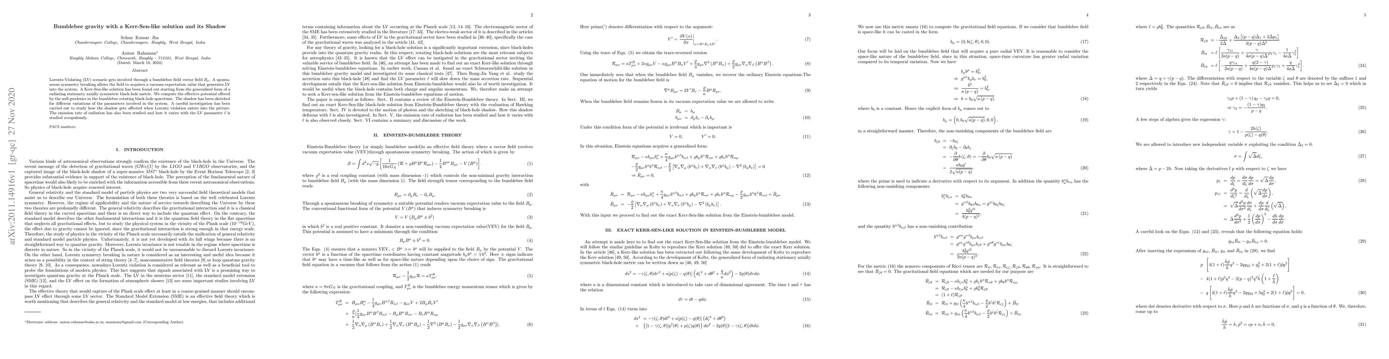 Lorentz-Violating (LV) scenario gets involved through a bumblebee field vector field $B_\mu$. A spontaneous symmetry breaking allows the field to acquires a vacuum expectation value that generates LV into the system. A Kerr-Sen-like solution has been found out starting from the generalized form of a radiating stationery axially symmetric black-hole metric. We compute the effective potential offered by the null geodesics in the bumblebee rotating black-hole spacetime. The shadow has been sketched for different variations of the parameters involved in the system. A careful investigation has been carried out to study how the shadow gets affected when Lorentz violation enters into the picture. The emission rate of radiation has also been studied and how it varies with the LV parameter $\ell$ is studied scrupulously.