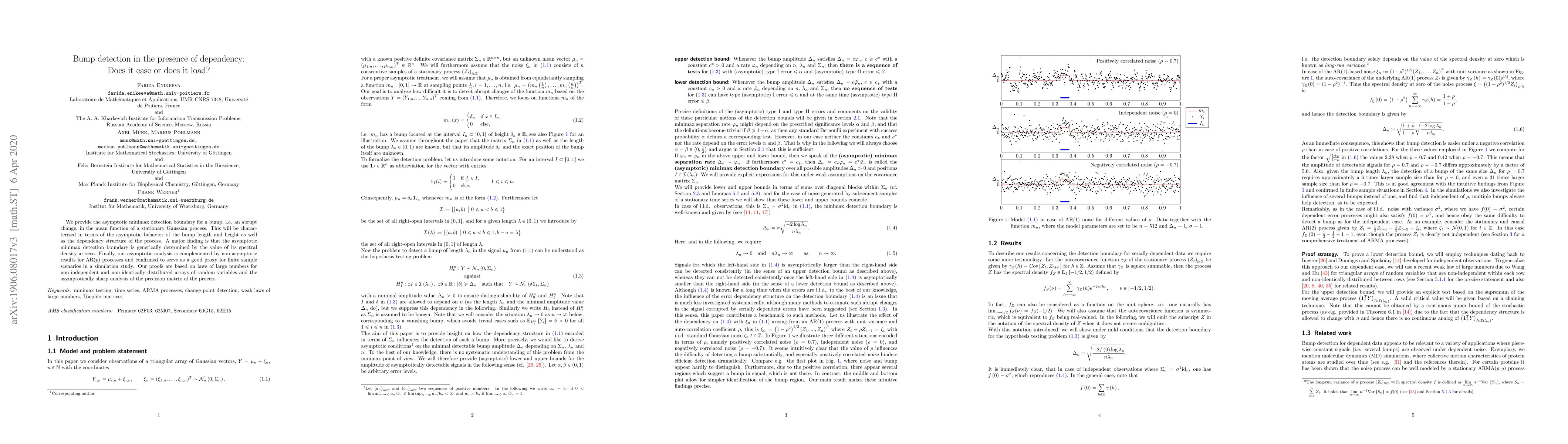 This research identifies the asymptotic minimax detection boundary for abrupt changes (bumps) in the mean of a Gaussian process, considering dependency structure. Key findings indicate that the boundary is largely determined by the spectral density at zero. The analysis is supported by non-asymptotic results for AR(p) processes and a simulation study, utilizing laws of large numbers for non-independent variables and precision matrix analysis.