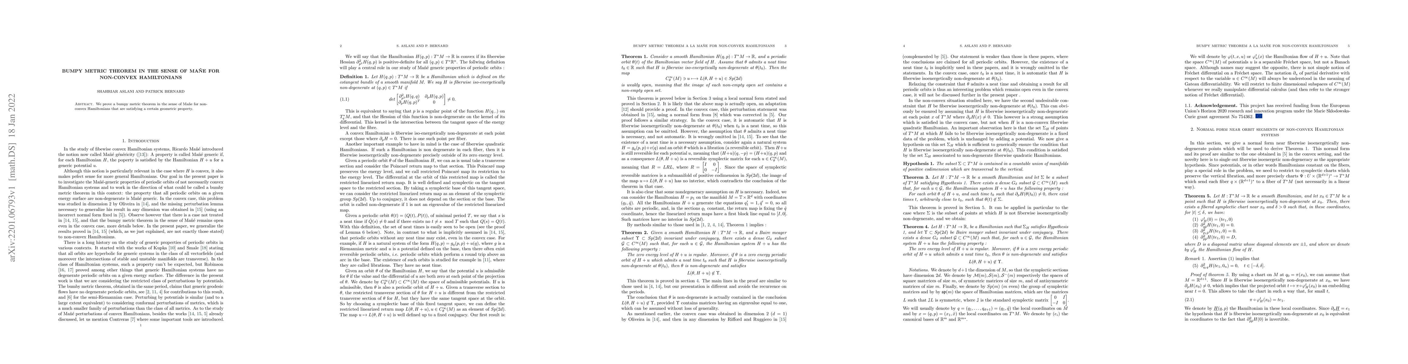 Researchers prove a bumpy metric theorem for non-convex Hamiltonians with specific geometric properties, advancing our understanding of these systems.