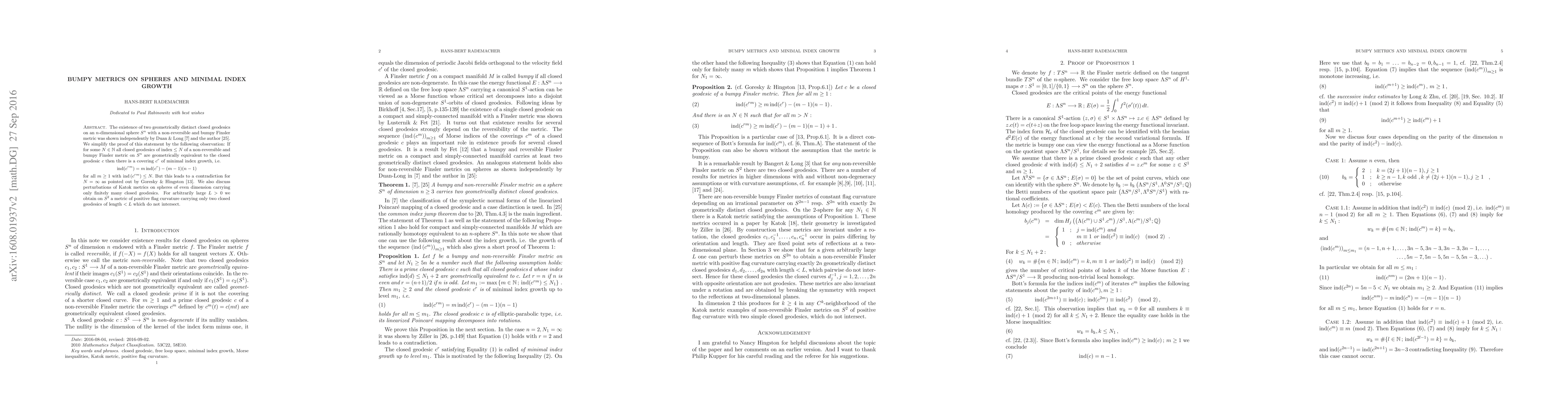 Researchers prove that on certain spheres with bumpy Finsler metrics, more than one closed geodesic exists; a key finding is the existence of covering geodesics with minimal index growth, leading to a contradiction for infinite N.