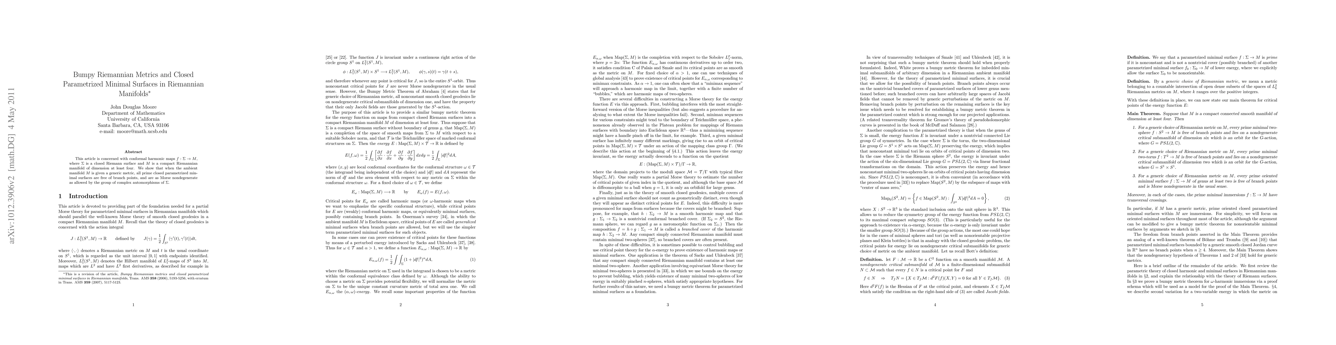 This article proves that if M is a smooth manifold of dimension at least four, then for generic choice of metric on M, all prime parametrized minimal surfaces in M are free of branch points and lie on nondegenerate critical submanifolds for the two-variable energy function which have the same dimension as the group of complex automorphisms of the domain Riemann surface.