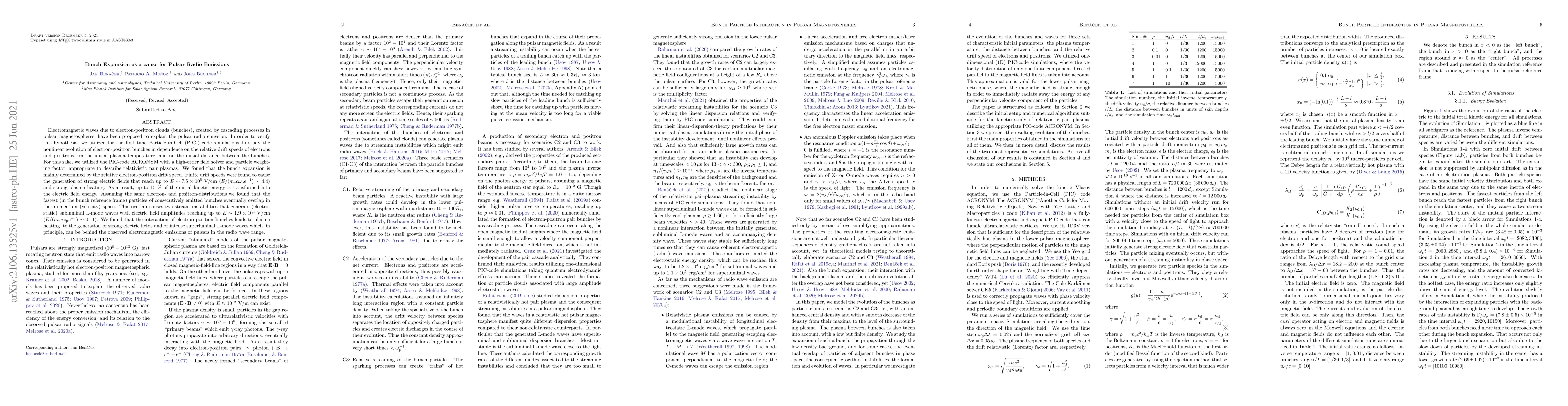 Electromagnetic waves due to electron-positron clouds (bunches), created by cascading processes in pulsar magnetospheres, have been proposed to explain the pulsar radio emission. In order to verify this hypothesis, we utilized for the first time Particle-in-Cell (PIC-) code simulations to study the nonlinear evolution of electron-positron bunches in dependence on the relative drift speeds of electrons and positrons, on the initial plasma temperature, and on the initial distance between the bunches. For this sake, we utilized the PIC-code ACRONYM with a high-order field solver and particle weighting factor, appropriate to describe relativistic pair plasmas. We found that the bunch expansion is mainly determined by the relative electron-positron drift speed. Finite drift speeds were found to cause the generation of strong electric fields that reach up to $E \sim 7.5 \times 10^{5}$ V/cm ($E / (m_\mathrm{e} c \omega_\mathrm{p} e^{-1}) \sim 4.4$) and strong plasma heating. As a result, up to 15~\% of the initial kinetic energy is transformed into the electric field energy. Assuming the same electron- and positron-distributions we found that the fastest (in the bunch reference frame) particles of consecutively emitted bunches eventually overlap in the momentum (velocity) space. This overlap causes two-stream instabilities that generate (electrostatic) subluminal L-mode waves with electric field amplitudes reaching up to $E \sim 1.9\times 10^{4}$ V/cm ($E / (m_\mathrm{e} c \omega_\mathrm{p} e^{-1}) \sim 0.11$). We found that the interaction of electron-position bunches leads to plasma heating, to the generation of strong electric fields and of intense superluminal L-mode waves which, in principle, can be behind the observed electromagnetic emissions of pulsars in the radio wave range.