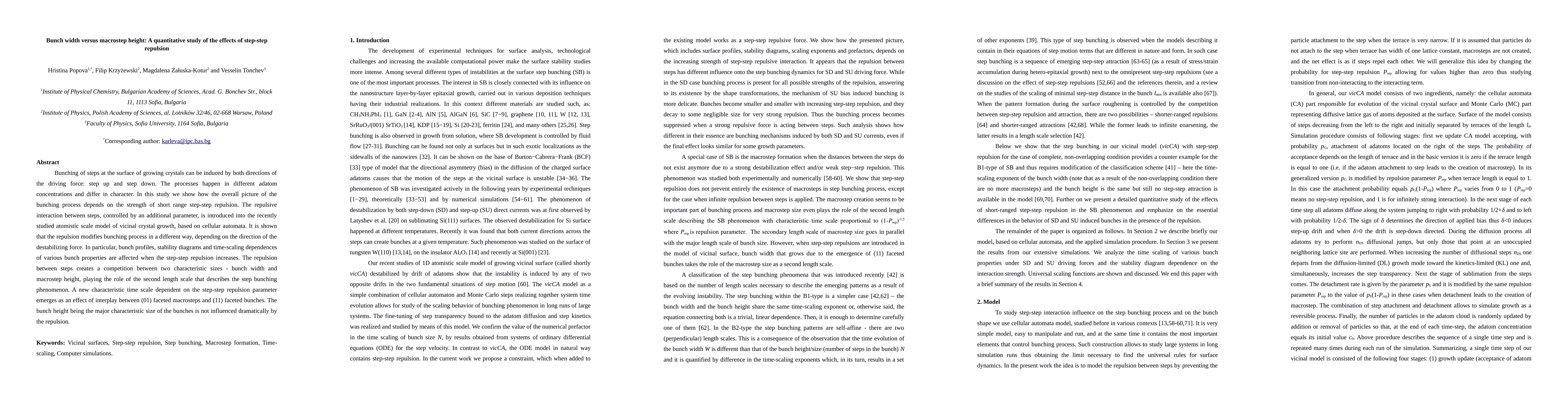 Bunching of steps at the surface of growing crystals can be induced by both directions of the driving force: step up and step down. The processes happen in different adatom concentrations and differ in character. In this study we show how the overall picture of the bunching process depends on the strength of short range step-step repulsion. The repulsive interaction between steps, controlled by an additional parameter, is introduced into the recently studied atomistic scale model of vicinal crystal growth, based on cellular automata. It is shown that the repulsion modifies bunching process in a different way, depending on the direction of the destabilizing force. In particular, bunch profiles, stability diagrams and time-scaling dependences of various bunch properties are affected when the step-step repulsion increases. The repulsion between steps creates a competition between two characteristic sizes - bunch width and macrostep height, playing the role of the second length scale that describes the step bunching phenomenon. A new characteristic time scale dependent on the step-step repulsion parameter emerges as an effect of interplay between (01) faceted macrosteps and (11) faceted bunches. The bunch height being the major characteristic size of the bunches is not influenced dramatically by the repulsion.