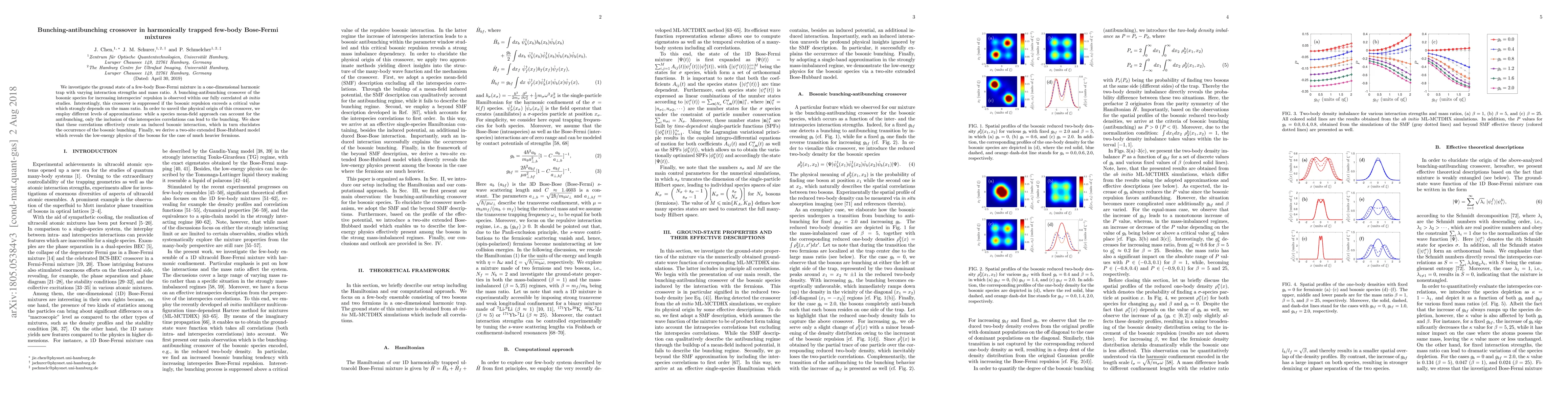 The research examines a few-body Bose-Fermi mixture in a harmonic trap, revealing a bosonic bunching-antibunching crossover with increasing interspecies repulsion. This crossover is suppressed when bosonic repulsion surpasses a critical value, dependent on the mass ratio. The study attributes this phenomenon to interspecies correlations creating an effective bosonic interaction, leading to bunching. A two-site extended Bose-Hubbard model explains the low-energy physics of bosons for heavily heavier fermions.