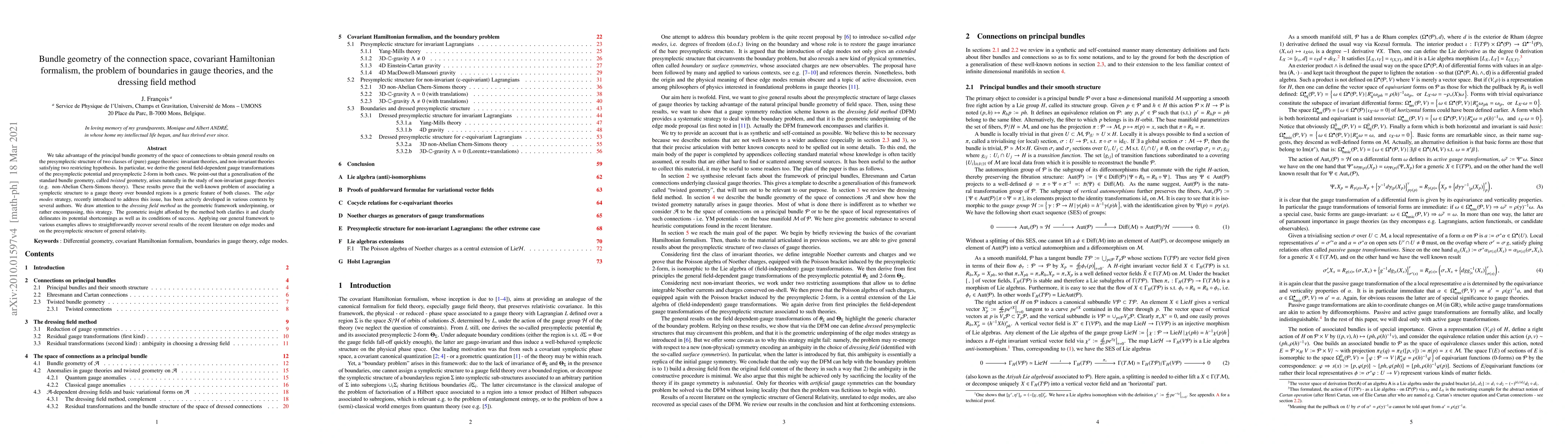 This paper explores the bundle geometry of connection spaces to derive presymplectic structures for gauge theories, highlighting the emergence of twisted geometry in non-invariant theories. It also discusses the dressing field method as a unifying geometric framework for addressing boundary issues in gauge theories.