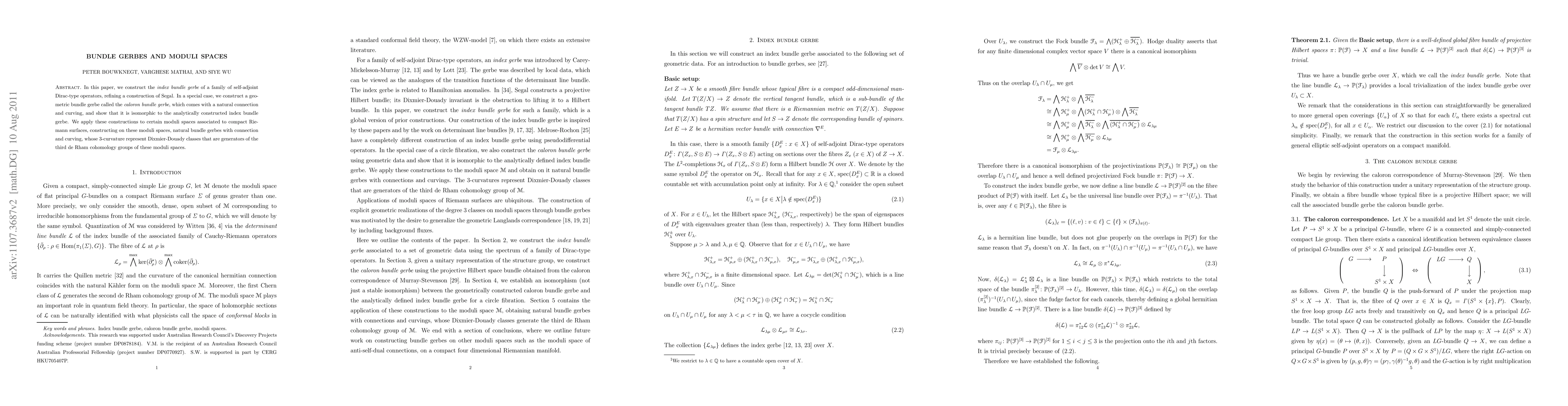 This paper constructs index bundle gerbes for self-adjoint Dirac-type operators and introduces the caloron bundle gerbe, showing its isomorphism to the analytically constructed index bundle gerbe. It applies these constructions to moduli spaces of compact Riemann surfaces, establishing bundle gerbes with connection and curving whose 3-curvature represents key Dixmier-Douady classes.