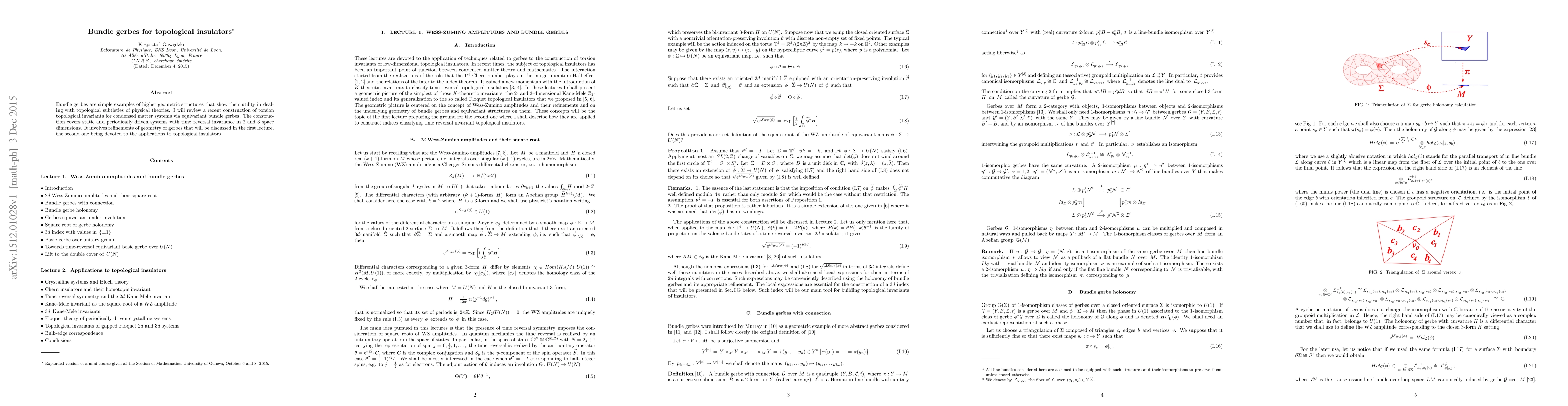 Bundle gerbes are simple examples of higher geometric structures that show their utility in dealing with topological subtleties of physical theories. I review a recent construction of torsion topological invariants for condensed matter systems via equivariant bundle gerbes. The construction covers static and periodically driven systems with time reversal invariance in 2 and 3 space dimensions. It involves refinements of geometry of gerbes that are discussed in the first lecture, the second one being devoted to the applications to topological insulators.