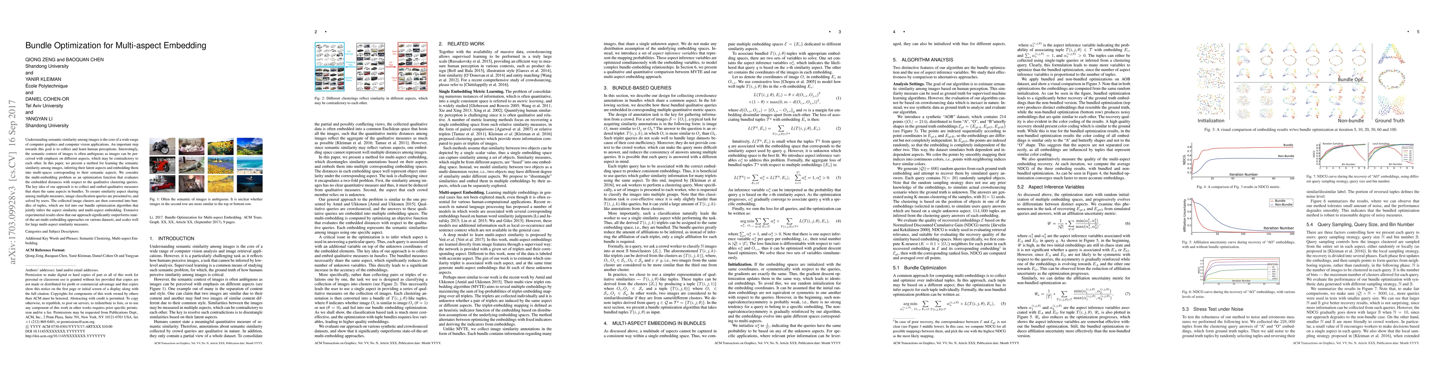 Understanding semantic similarity among images is the core of a wide range of computer vision applications. An important step towards this goal is to collect and learn human perceptions. Interestingly, the semantic context of images is often ambiguous as images can be perceived with emphasis on different aspects, which may be contradictory to each other. In this paper, we present a method for learning the semantic similarity among images, inferring their latent aspects and embedding them into multi-spaces corresponding to their semantic aspects. We consider the multi-embedding problem as an optimization function that evaluates the embedded distances with respect to the qualitative clustering queries. The key idea of our approach is to collect and embed qualitative measures that share the same aspects in bundles. To ensure similarity aspect sharing among multiple measures, image classification queries are presented to, and solved by users. The collected image clusters are then converted into bundles of tuples, which are fed into our bundle optimization algorithm that jointly infers the aspect similarity and multi-aspect embedding. Extensive experimental results show that our approach significantly outperforms state-of-the-art multi-embedding approaches on various datasets, and scales well for large multi-aspect similarity measures.