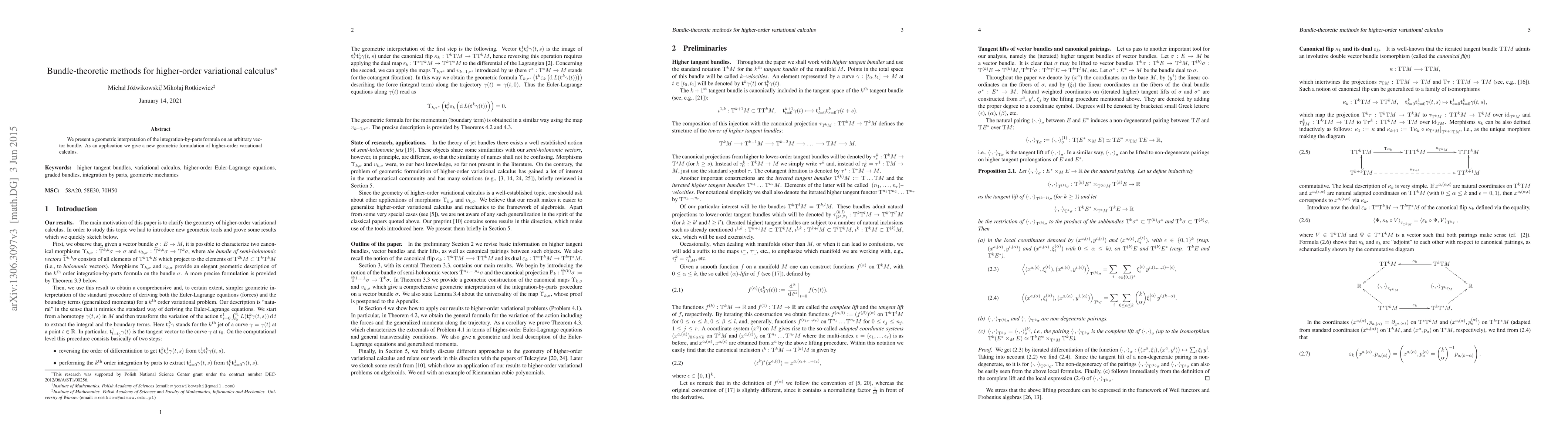 Two-line summary: This paper introduces a geometric perspective on the integration-by-parts formula within the context of vector bundles, leading to a novel geometric formulation of higher-order variational calculus. The approach emphasizes the intrinsic structure of bundles to reframe traditional variational problems.