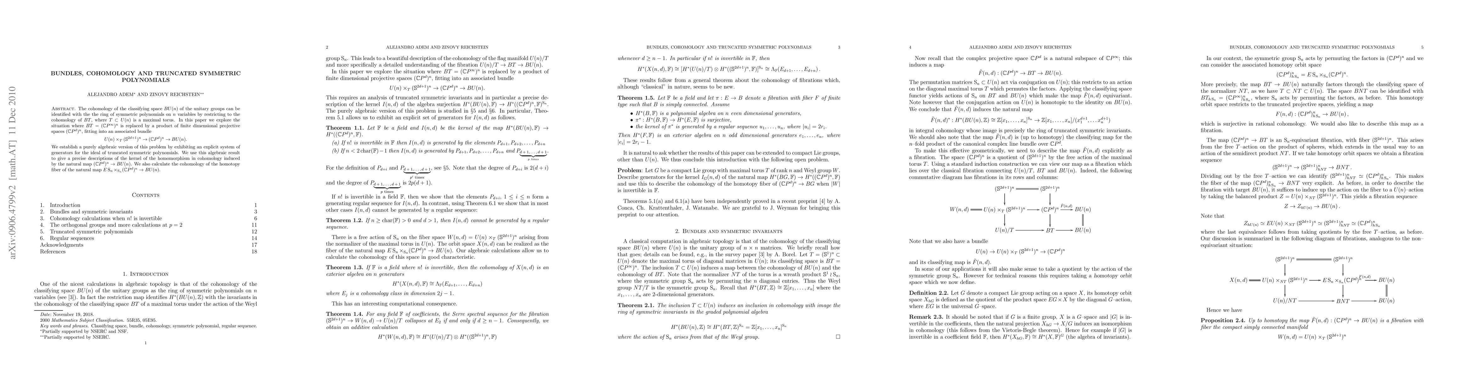 The cohomology of the classifying space BU(n) of the unitary groups can be identified with the ring of symmetric polynomials on n variables by restricting to the cohomology of BT, where T is a maximal torus in U(n). In this paper we explore the situation where BT = (CP^{infinity})^n is replaced by a product of finite dimensional projective spaces (CP^d)^n, fitting into an associated bundle U(n) x_T (S^{2d+1})^n -> (CP^d)^n -> BU(n). We establish a purely algebraic version of this problem by exhibiting an explicit system of generators for the ideal of truncated symmetric polynomials. We use this algebraic result to give a precise descriptions of the kernel of the homomorphism in cohomology induced by the natural map (CP^d)^n -> BU(n). We also calculate the cohomology of the homotopy fiber of the natural map ES_n x_{S_n} (CP^d)^n -> BU(n).