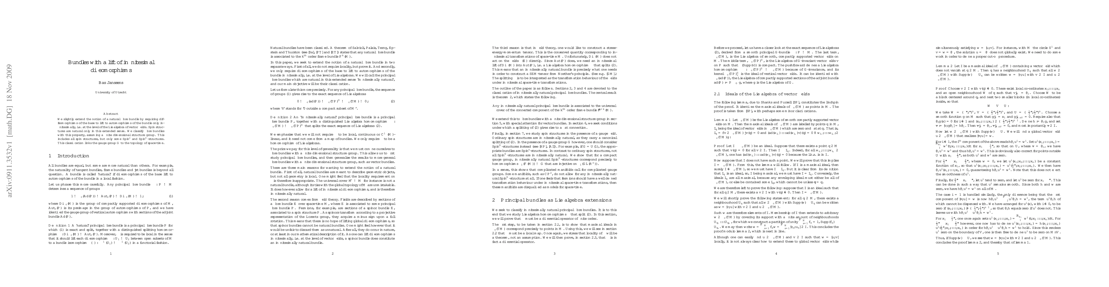 Researchers extended the concept of natural fibre bundles to require diffeomorphisms lift to automorphisms at a Lie algebra level, classifying fibre bundles with this property and linking gauge group G to space-time topology.