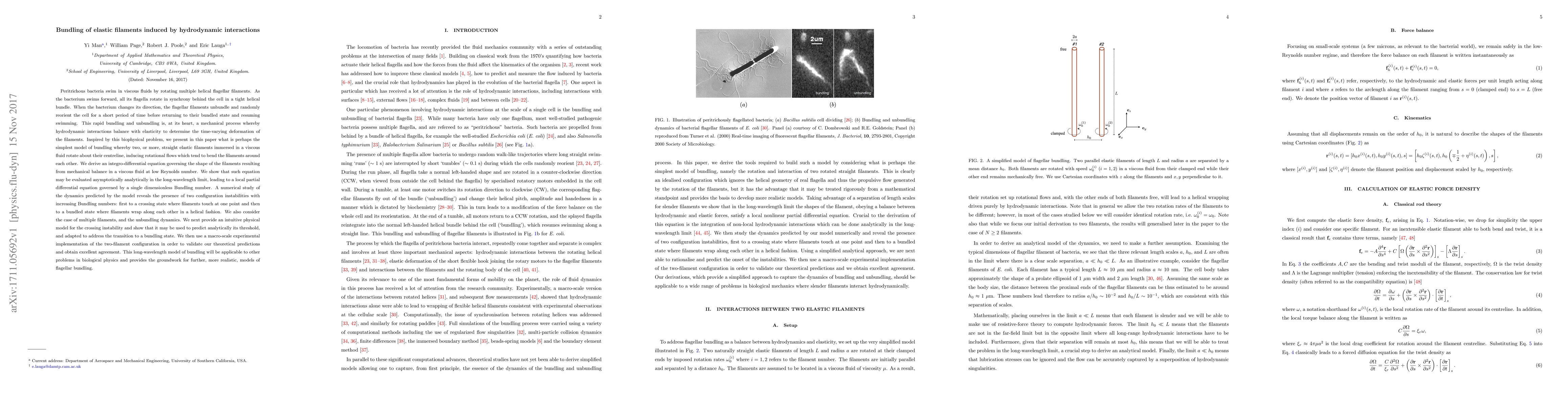 This paper models the bundling of elastic filaments driven by hydrodynamic interactions, deriving an integro-differential equation to describe filament deformation. The study reveals two configuration instabilities: a crossing state and a helical bundling state, validated through theoretical analysis and experimental implementation.