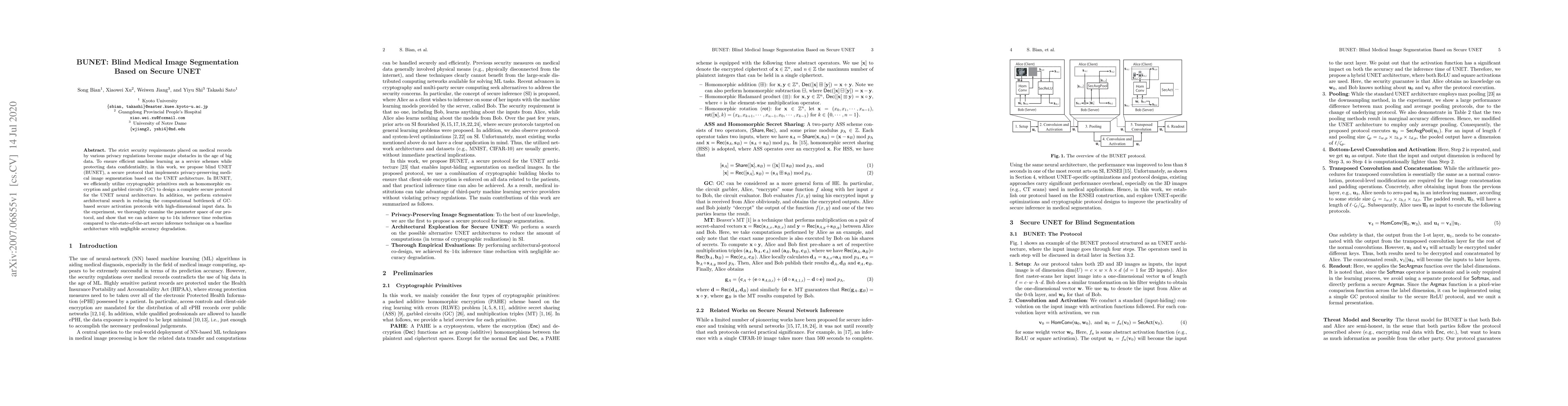 The paper proposes BUNET, a secure UNET-based protocol for privacy-preserving medical image segmentation using homomorphic encryption and garbled circuits. The authors achieve up to 14x reduction in inference time compared to existing secure techniques, with minimal loss in accuracy.