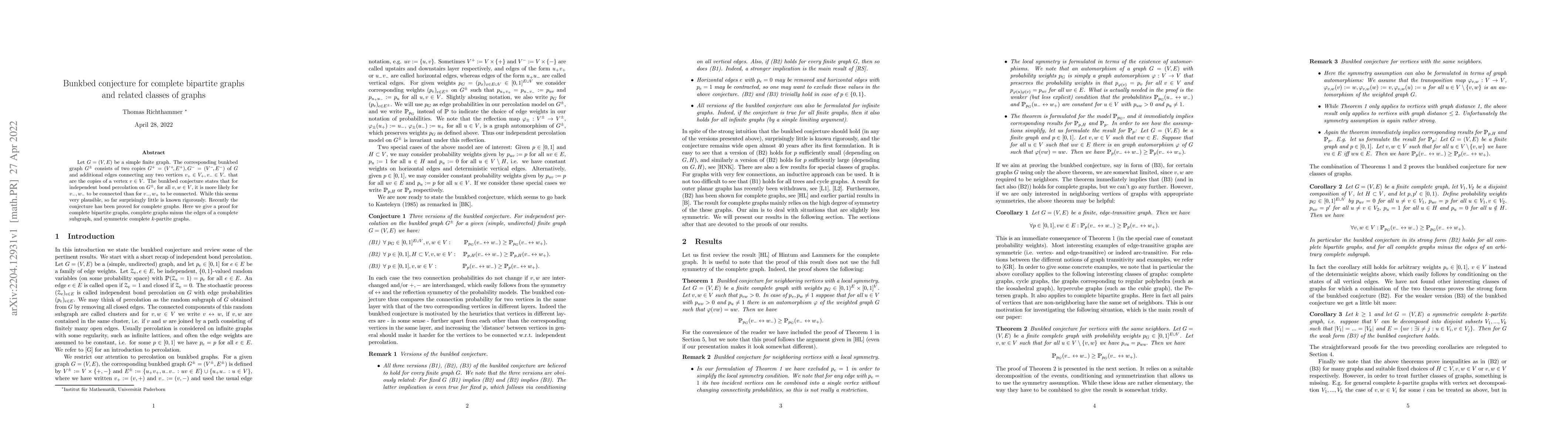 The paper proves a conjecture for independent bond percolation on bunkbed graphs, showing it's more likely for adjacent vertices to connect in the negative copy than in the positive copy.