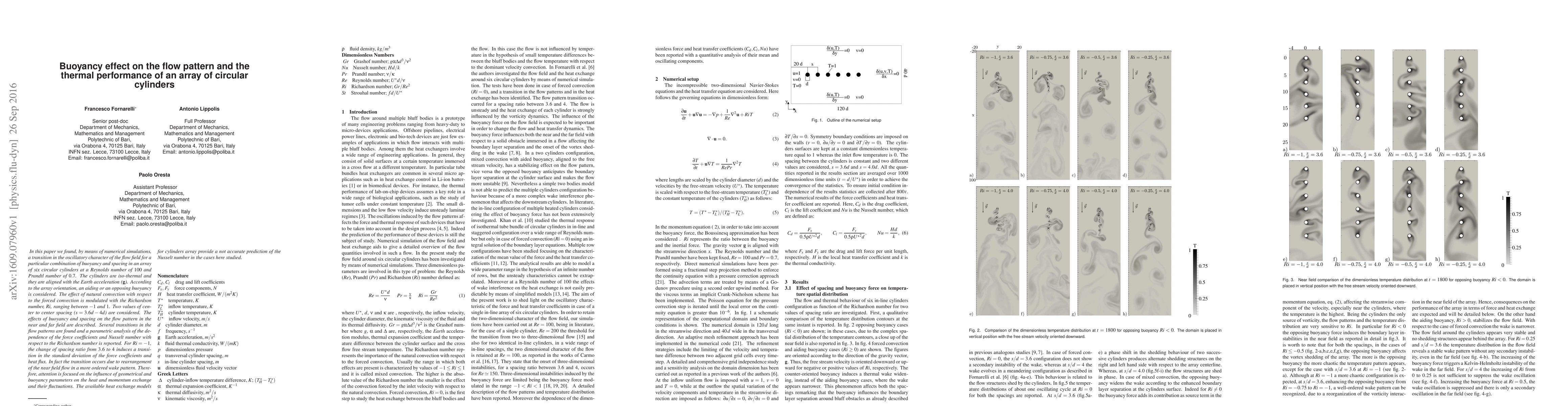 In this paper we found, by means of numerical simulations, a transition in the oscillatory character of the flow field for a particular combination of buoyancy and spacing in an array of six circular cylinders at a Reynolds number of 100 and Prandtl number of 0.7. The cylinders are iso-thermal and they are aligned with the Earth acceleration (g). According to the array orientation, an aiding or an opposing buoyancy is considered. The effect of natural convection with respect to the forced convection is modulated with the Richardson number, Ri, ranging between -1 and 1. Two values of center to center spacing (s=3.6d - 4d) are considered. The effects of buoyancy and spacing on the flow pattern in the near and far field are described. Several transitions in the flow patterns are found and a parametric analysis of the dependence of the force coefficients and Nusselt number with respect to the Richardson number is reported. For Ri=-1, the change of spacing ratio from 3.6 to 4 induces a transition in the standard deviation of the force coefficients and heat flux. In fact the transition occurs due to rearrangement of the near field flow in a more ordered wake pattern. Therefore, attention is focused on the influence of geometrical and buoyancy parameters on the heat and momentum exchange and their fluctuations. The available heat exchange models for cylinders array provide a not accurate prediction of the Nusselt number in the cases here studied.