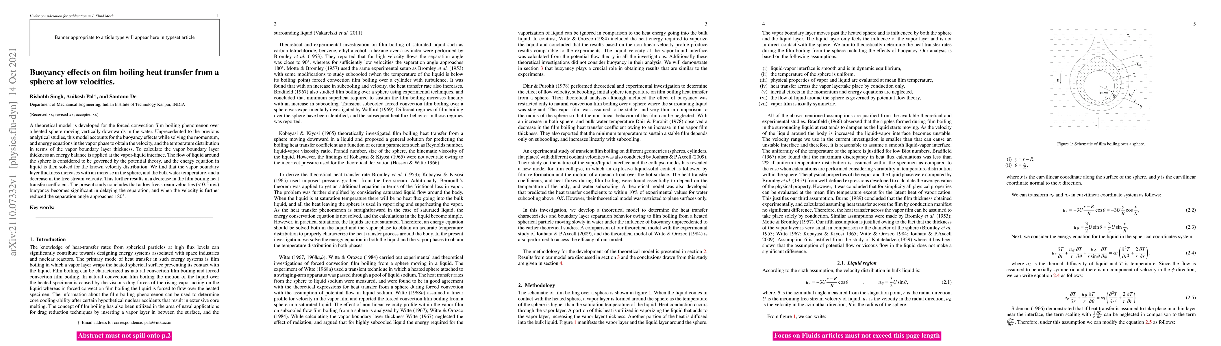 A theoretical model predicts that buoyancy effects delay film boiling heat transfer over a sphere at low velocities, with thicker vapor boundary layers increasing heat transfer resistance.