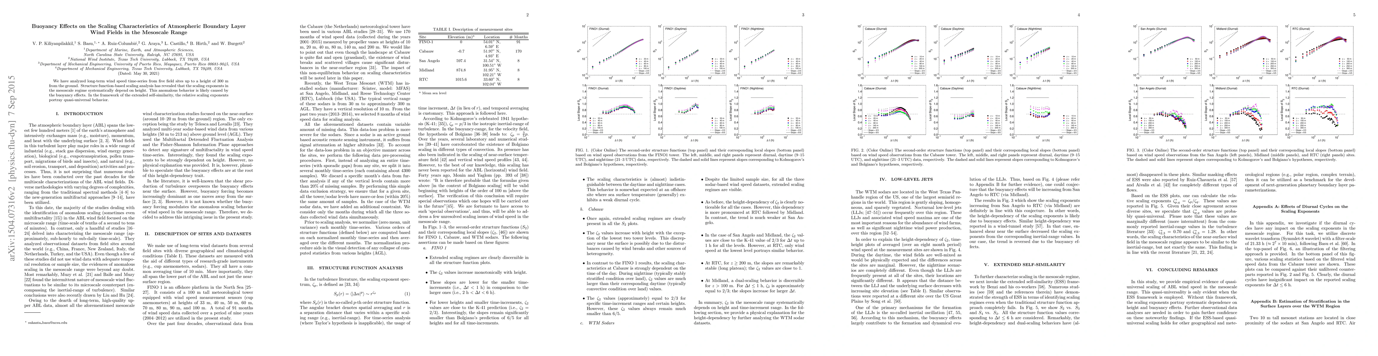 A study analyzing wind speed data from five field sites found that buoyancy effects influence scaling characteristics of atmospheric boundary layer wind fields in the mesoscale range, leading to anomalous height-dependent behavior.