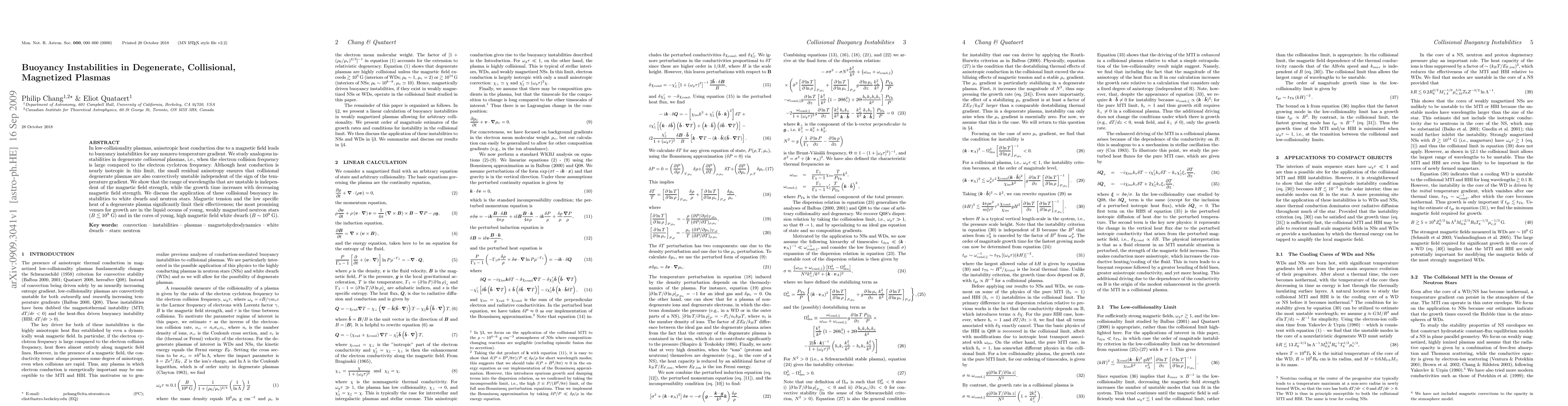 This paper investigates buoyancy instabilities in degenerate, collisional, magnetized plasmas, showing that despite nearly isotropic heat conduction, these plasmas are convectively unstable due to small residual anisotropy. The study finds that the range of unstable wavelengths is unaffected by magnetic field strength, while growth time increases with weaker fields, with potential implications for young neutron stars and high magnetic field white dwarfs.
