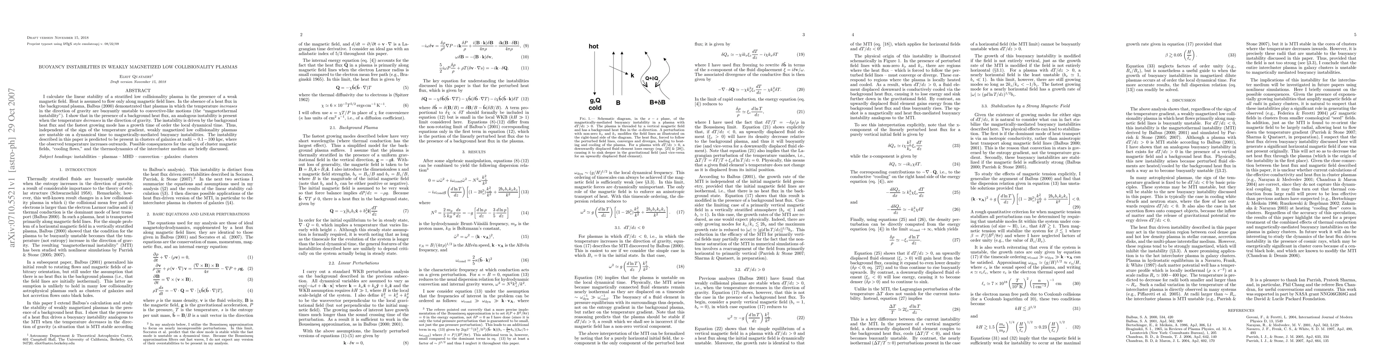 The paper derives a dispersion relation for magnetically-mediated buoyancy instabilities in weakly magnetized, low collisionality plasmas with background heat flux, extending previous work on the magnetothermal instability.
