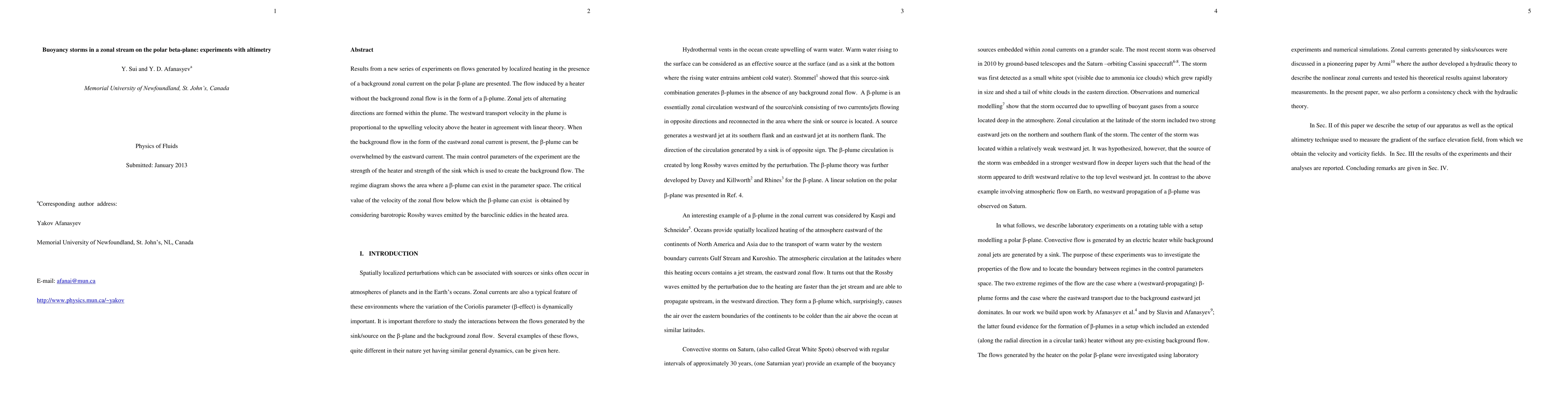 This study investigates buoyancy-driven storms in a zonal stream on the polar beta-plane, revealing the formation of beta-plumes and alternating zonal jets under localized heating. The presence of an eastward zonal current can suppress the beta-plume, with the experiment's control parameters being heater strength and background flow strength.