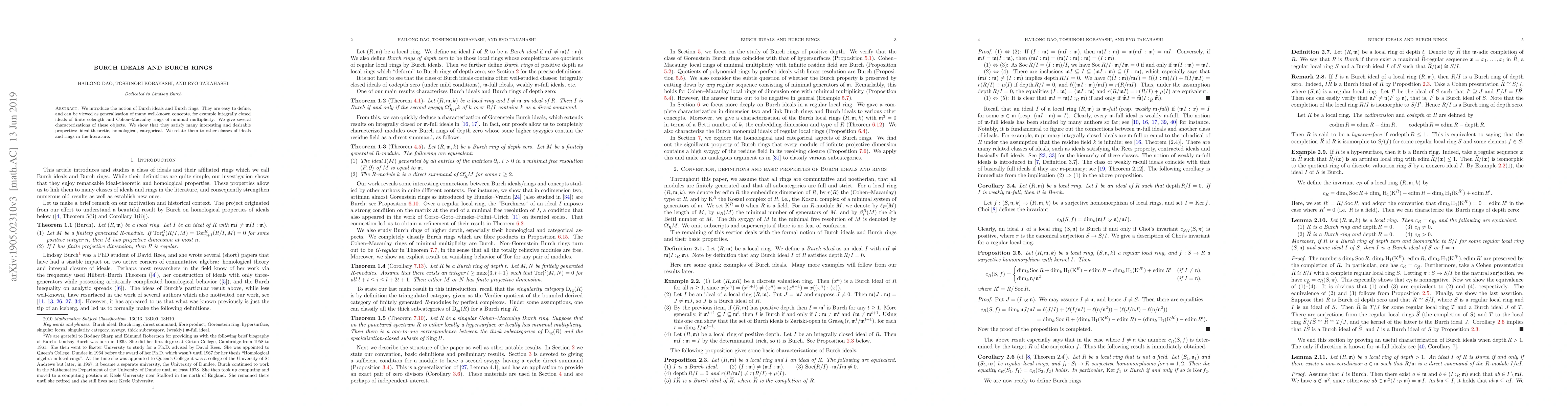 This paper introduces Burch ideals and Burch rings, generalizing concepts like integrally closed ideals and Cohen-Macaulay rings, and provides various characterizations and properties of these objects, including ideal-theoretic, homological, and categorical features.