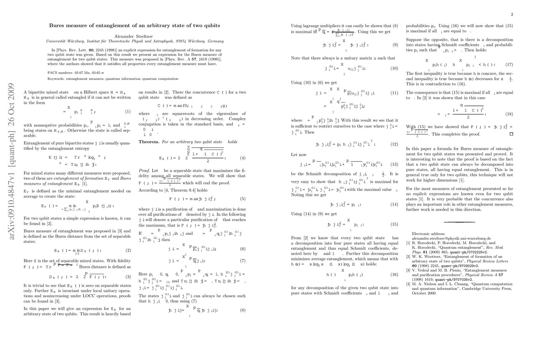 In Phys. Rev. Lett. 80, 2245 (1998) an explicit expression for entanglement of formation for any two qubit state was given. Based on this result we present an expression for the Bures measure of entanglement for two qubit states. This measure was proposed in Phys. Rev. A 57, 1619 (1998), where the authors showed that it satisfies all properties every entanglement measure must have.