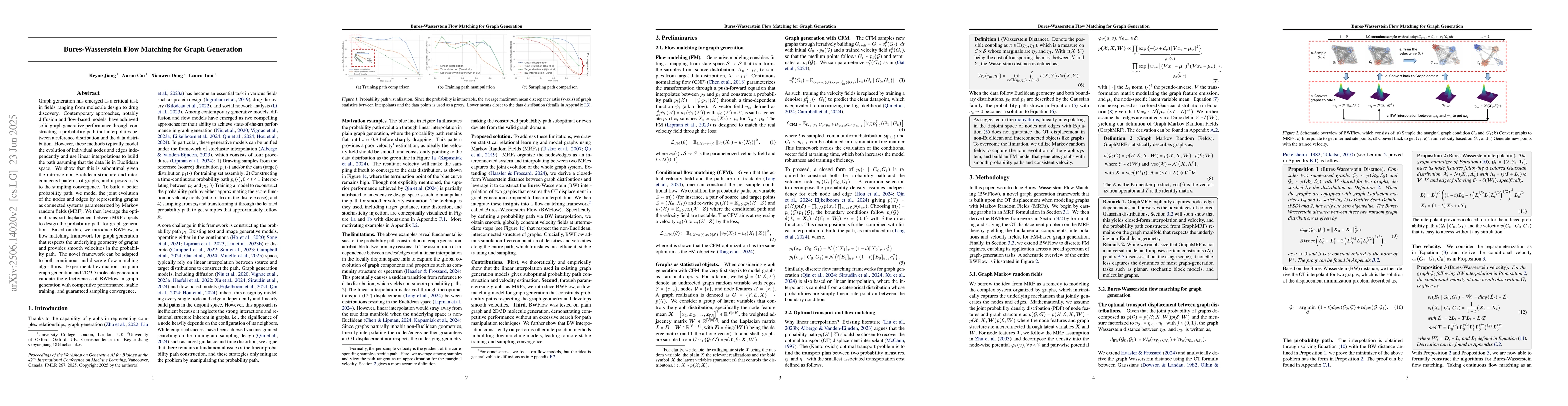 Graph generation has emerged as a critical task in fields ranging from molecule design to drug discovery. Contemporary approaches, notably diffusion and flow-based models, have achieved solid graph generative performance through constructing a probability path that interpolates between a reference distribution and the data distribution. However, these methods typically model the evolution of individual nodes and edges independently and use linear interpolations to build the path assuming that the data lie in Euclidean space. We show that this is suboptimal given the intrinsic non-Euclidean structure and interconnected patterns of graphs, and it poses risks to the sampling convergence. To build a better probability path, we model the joint evolution of the nodes and edges by representing graphs as connected systems parameterized by Markov random fields (MRF). We then leverage the optimal transport displacement between MRF objects to design the probability path for graph generation. Based on this, we introduce BWFlow, a flow-matching framework for graph generation that respects the underlying geometry of graphs and provides smooth velocities in the probability path. The novel framework can be adapted to both continuous and discrete flow-matching algorithms. Experimental evaluations in plain graph generation and 2D/3D molecule generation validate the effectiveness of BWFlow in graph generation with competitive performance, stable training, and guaranteed sampling convergence.