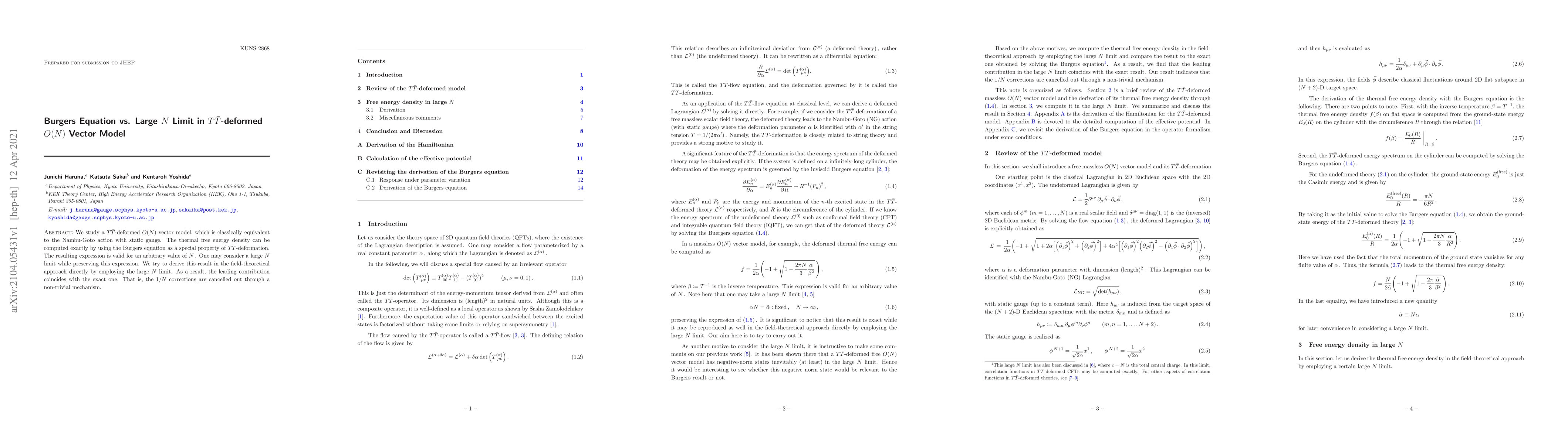 This paper studies a $Tar{T}$-deformed $O(N)$ vector model and finds that its thermal free energy density can be computed exactly using the Burgers equation, valid for any value of N, with no 1/N corrections in the large N limit.