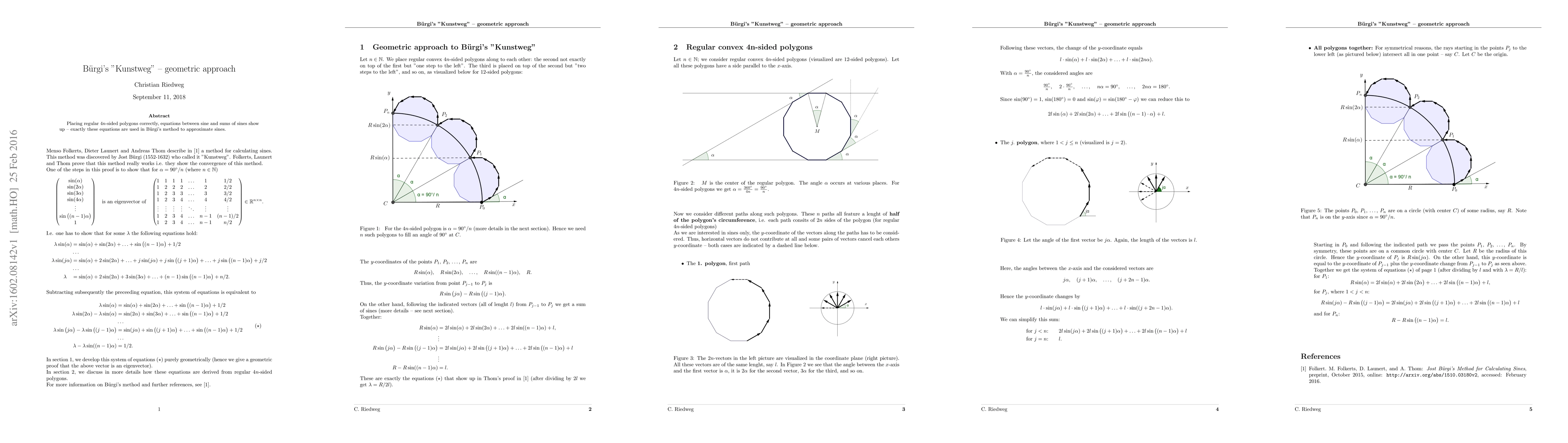 Placing regular 4n-sided polygons correctly, equations between sine and sums of sines show up -- exactly these equations are used in B\"urgi's method to approximate sines.