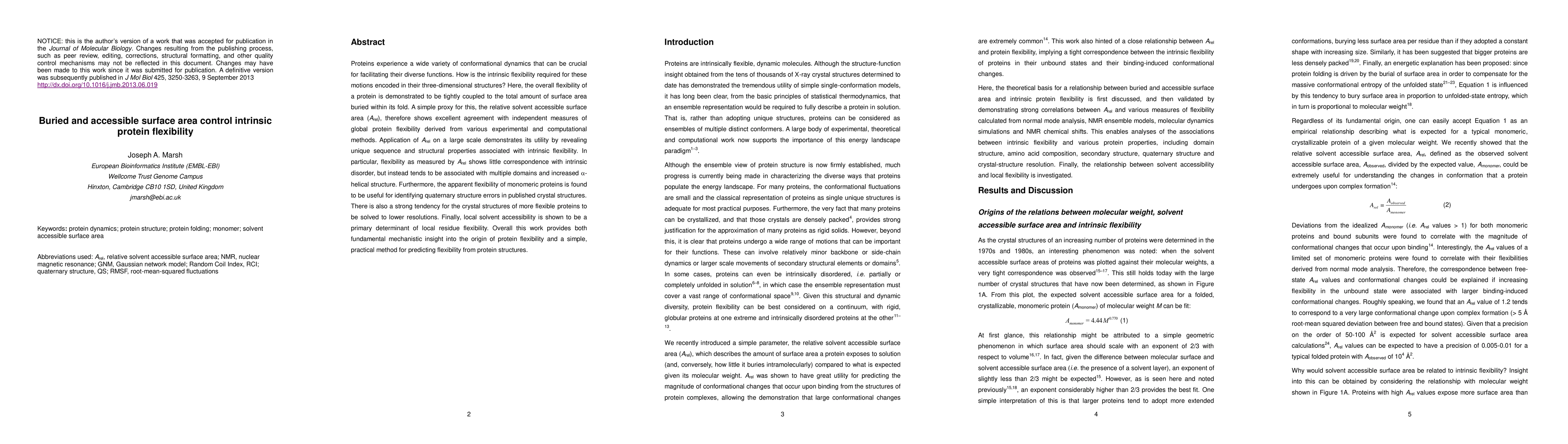 This paper demonstrates that a protein's intrinsic flexibility is closely linked to the amount of buried surface area within its structure, with relative solvent accessible surface area (Arel) serving as a reliable proxy. The study reveals that flexibility correlates with multiple domains and increased α-helical content, rather than intrinsic disorder, and provides a practical method for predicting protein flexibility from structural data.