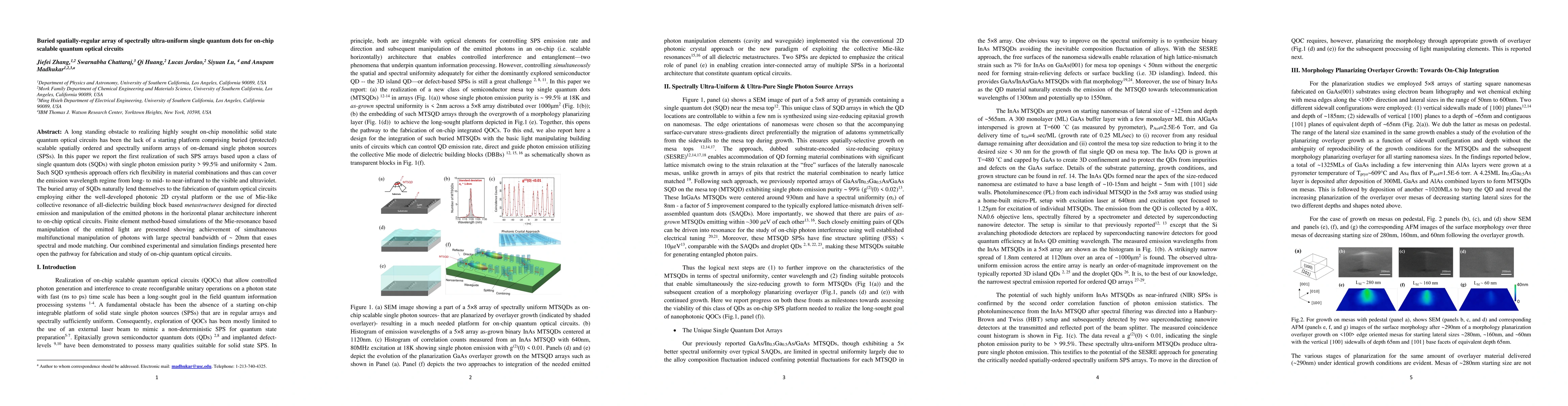 This paper presents the first realization of buried, spatially-regular arrays of spectrally ultra-uniform single quantum dots (SQDs) for scalable on-chip quantum optical circuits, achieving single photon emission purity > 99.5% and uniformity < 2nm. The proposed Mie-resonance based manipulation of emitted photons demonstrates multifunctional control over a large spectral bandwidth, paving the way for advanced on-chip quantum optical circuits.