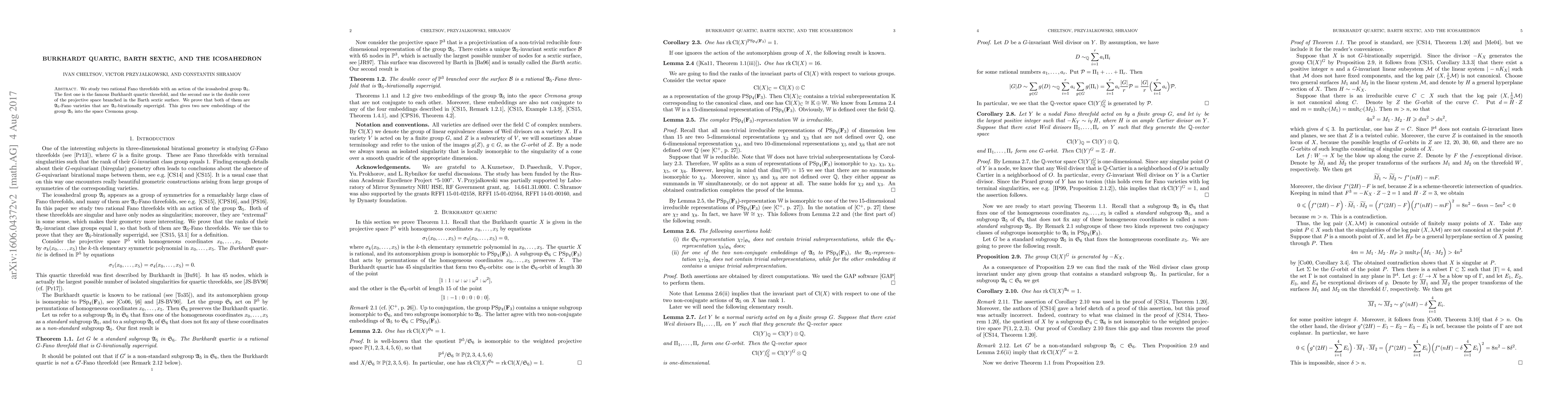 We study two rational Fano threefolds with an action of the icosahedral group $\mathfrak{A}_5$. The first one is the famous Burkhardt quartic threefold, and the second one is the double cover of the projective space branched in the Barth sextic surface. We prove that both of them are $\mathfrak{A}_5$-Fano varieties that are $\mathfrak{A}_5$-birationally superrigid. This gives two new embeddings of the group $\mathfrak{A}_5$ into the space Cremona group.
