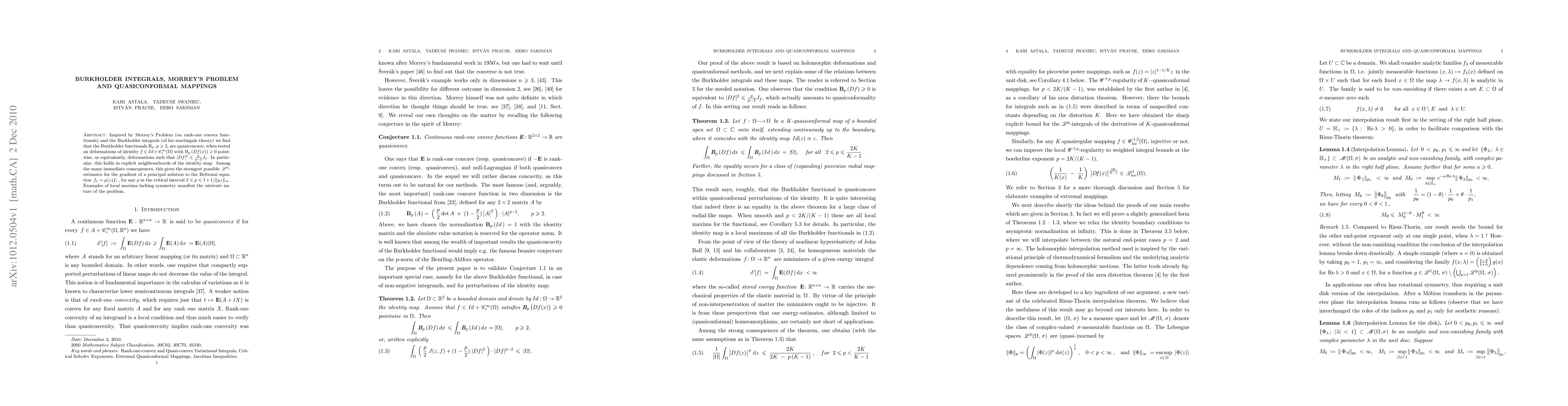 Inspired by Morrey's Problem (on rank-one convex functionals) and the Burkholder integrals (of his martingale theory) we find that the Burkholder functionals $B_p$, $p \ge 2$, are quasiconcave, when tested on deformations of identity $f\in Id + C^\infty_0(\Omega)$ with $B_p(Df(x)) \ge 0$ pointwise, or equivalently, deformations such that $|Df|^2 \leq \frac{p}{p-2} J_f$. In particular, this holds in explicit neighbourhoods of the identity map. Among the many immediate consequences, this gives the strongest possible $L^p$- estimates for the gradient of a principal solution to the Beltrami equation $\f_{\bar{z}} = \mu(z) f_z$, for any $p$ in the critical interval $2 \leq p \leq 1+1/\|\mu_f\|_\infty$. Examples of local maxima lacking symmetry manifest the intricate nature of the problem.