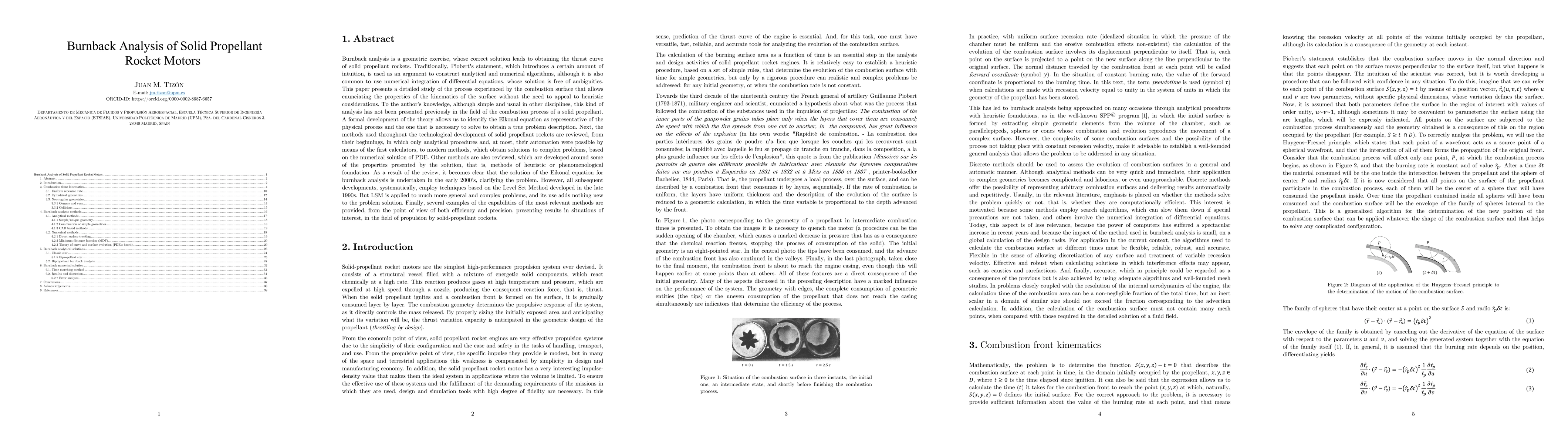 Burnback analysis is a geometric exercise, whose correct solution leads to obtaining the thrust curve of solid propellant rockets. Traditionally, Piobert statement, which introduces a certain amount of intuition, is used as an argument to construct analytical and numerical algorithms, although it is also common to use numerical integration of differential equations, whose solution is free of ambiguities. This paper presents a detailed study of the process experienced by the combustion surface that allows enunciating the properties of the kinematics of the surface without the need to appeal to heuristic considerations. Next, the methods used throughout the technological development of solid propellant rockets are reviewed, from their beginnings to modern methods, which obtain solutions to complex problems, based on the numerical solution of PDE. Other methods are also reviewed, which are developed around some of the properties presented by the solution, that is, methods of heuristic or phenomenological foundation. As a result of the review, it becomes clear that the solution of the Eikonal equation for burnback analysis is undertaken in the early 2000, clarifying the problem. Finally, several examples of the capabilities of the most relevant methods are provided, from the point of view of both efficiency and precision, presenting results in situations of interest, in the field of propulsion by solid-propellant rockets.