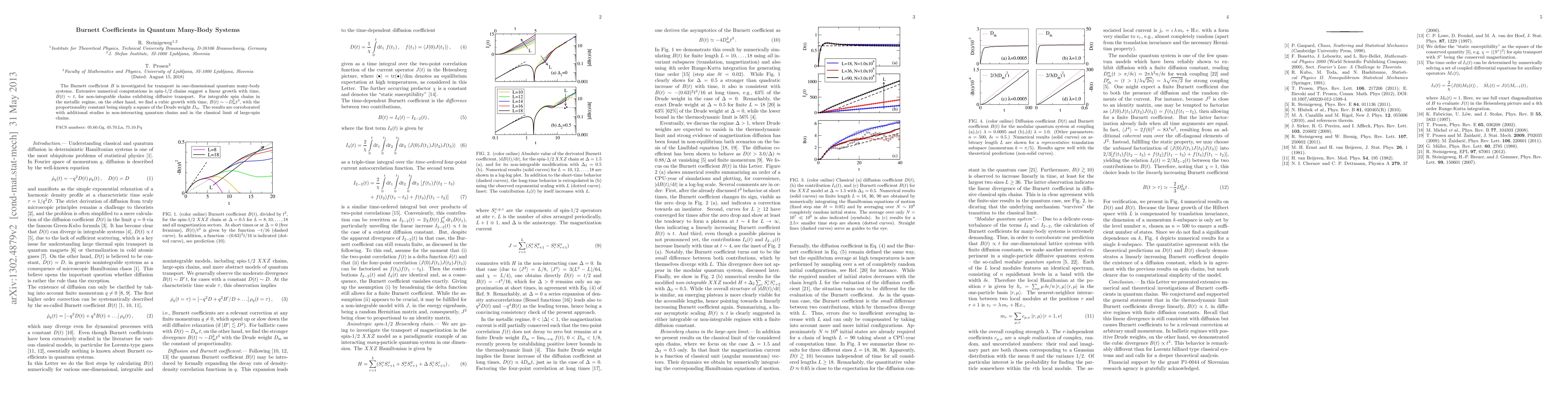 The research investigates the Burnett coefficient B in quantum many-body systems, finding linear growth B(t) ∼ t in non-integrable chains with diffusive transport, and cubic growth B(t) ∼ -D_m^2 t^3 in integrable metallic chains. Results are supported by studies in non-interacting chains and classical large-spin limits.