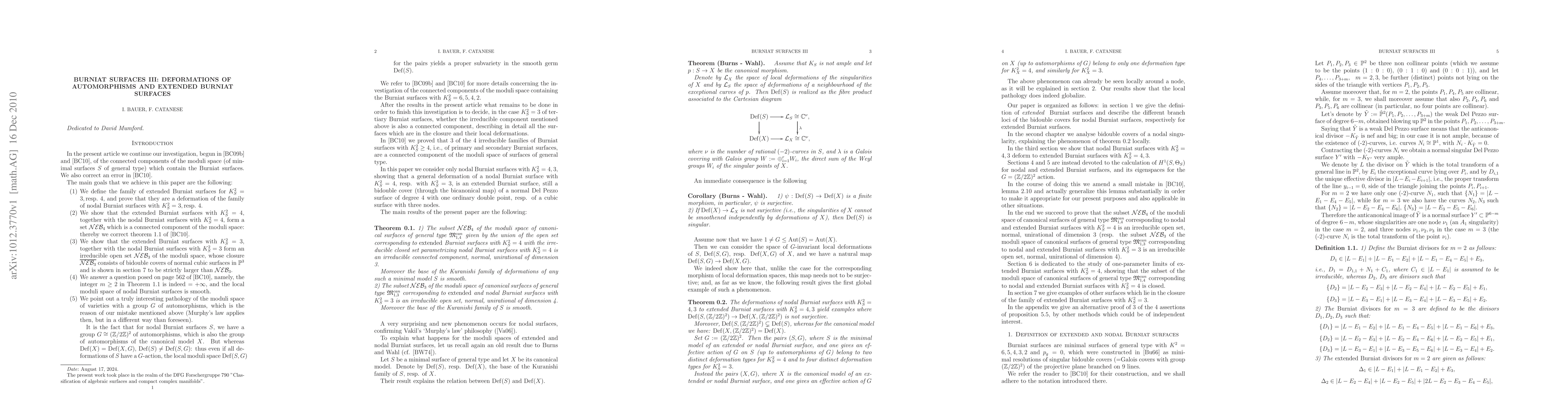 We continue our investigation of the connected components of the moduli space of surfaces of general type containing the Burniat surfaces, correcting a mistake in part II. We define the family of extended Burniat surfaces with K_S^2 = 4, resp. 3, and prove that they are a deformation of the family of nodal Burniat surfaces with K_S^2 = 4, resp. 3. We show that the extended Burniat surfaces together with the nodal Burniat surfaces with K_S^2=4 form a connected component of the moduli space. We prove that the extended Burniat surfaces together with the nodal Burniat surfaces with K_S^2=3 form an irreducible open set in the moduli space. Finally we point out an interesting pathology of the moduli space of surfaces of general type given together with a group of automorphisms G. In fact, we show that for the minimal model S of a nodal Burniat surface (G = (\ZZ/2 \ZZ)^2) we have Def(S,G) \neq Def(S), whereas for the canonical model X it holds Def(X,G) = Def(X). All deformations of S have a G-action, but there are different deformation types for the pairs (S,G) of the minimal models S together with the G-action, while the pairs (X,G) have a unique deformation type.