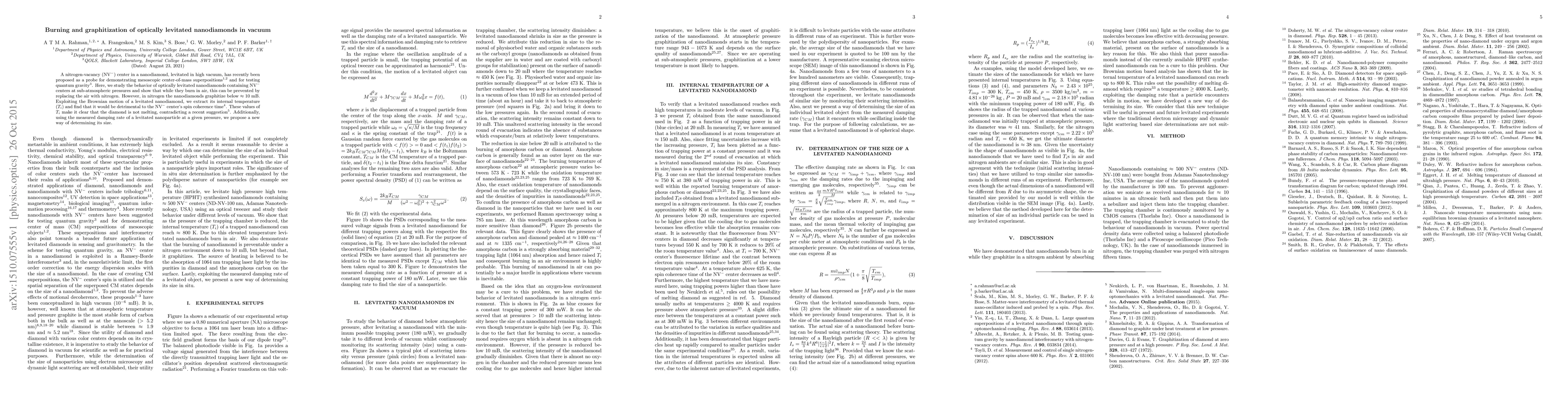 This paper investigates the burning and graphitization of optically levitated nanodiamonds containing NV$^-$ centers under various pressures, finding that while nitrogen prevents combustion, it induces graphitization below 10 mB. The study also determines the internal temperature, revealing it is not melting and thus not detrimental to NV$^-$ center coherence.