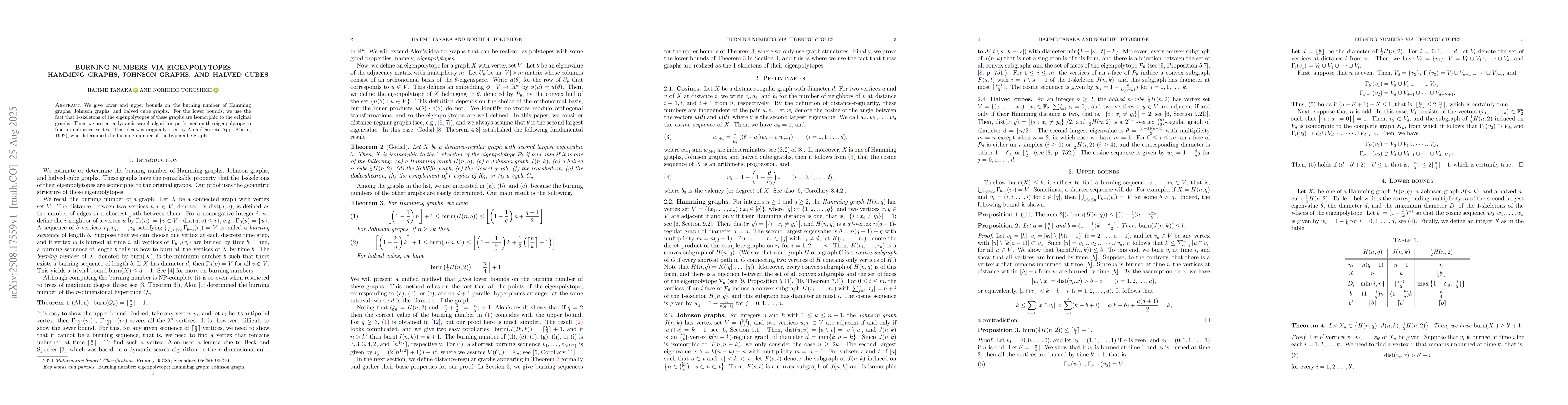 We give lower and upper bounds on the burning number of Hamming graphs, Johnson graphs, and halved cube graphs. For the lower bounds, we use the fact that $1$-skeletons of the eigenpolytopes of these graphs are isomorphic to the original graphs. Then, we present a dynamic search algorithm performed on the eigenpolytope to find an unburned vertex. This idea was originally used by Alon (Discrete Appl.\ Math.,\ 1992), who determined the burning number of the hypercube graphs.
