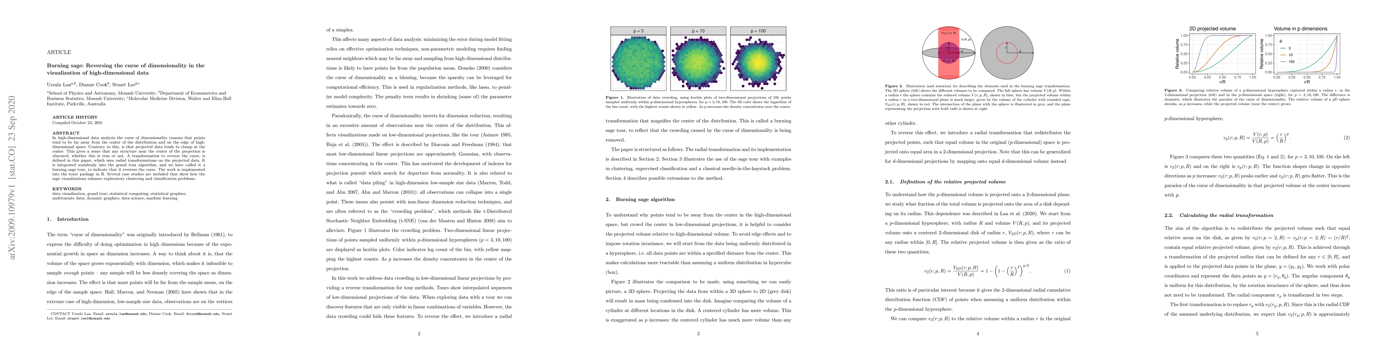 This paper proposes a "burning sage tour" transformation to reverse the curse of dimensionality in the visualization of high-dimensional data, using radial transformations to project data that clumps at the center, thereby enhancing exploratory clustering and classification. The method is implemented in the tourr package in R, with case studies demonstrating its effectiveness.