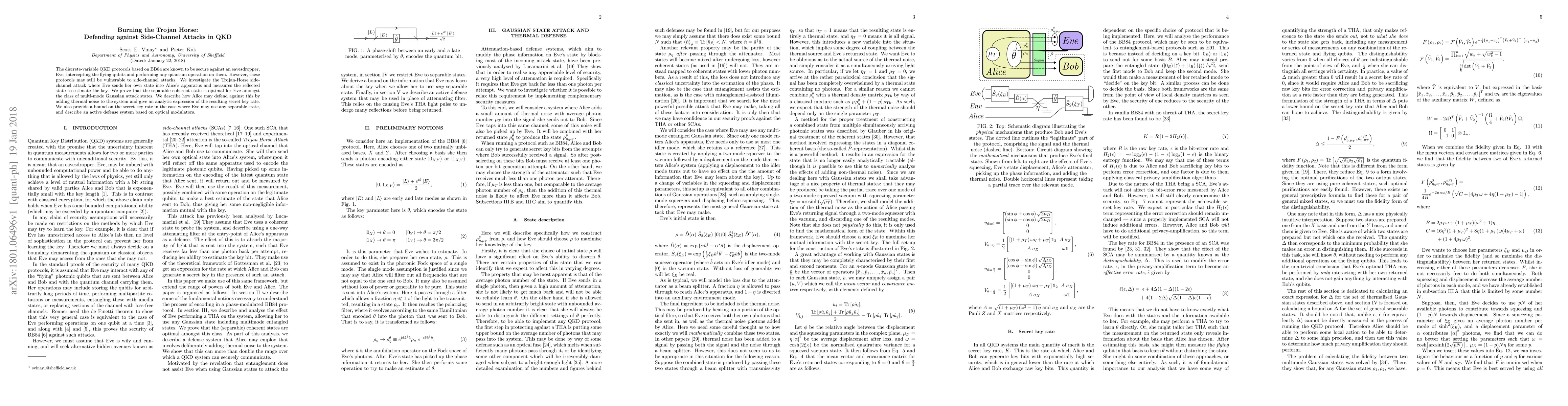 This paper investigates the vulnerability of discrete-variable QKD protocols to Trojan-Horse side-channel attacks, where an eavesdropper measures reflected states to estimate the key. It proposes a defense mechanism involving thermal noise addition and describes an active defense system using optical modulators to maintain secure communication.