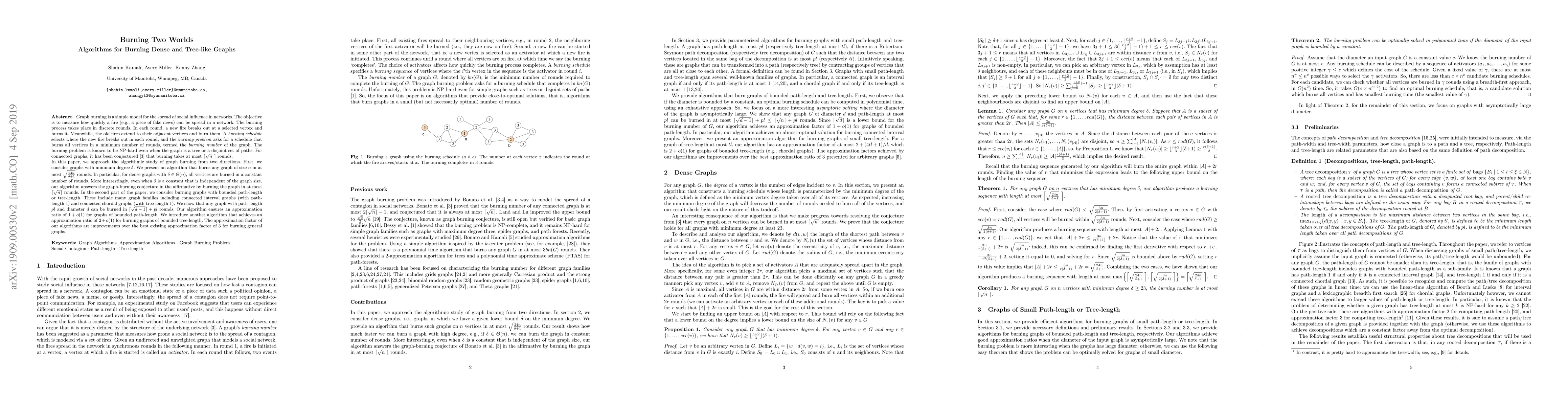This paper studies algorithms for the graph burning problem, focusing on spreading influence in networks. It presents efficient burning schedules for dense graphs and those with bounded path-length or tree-length, achieving burning times of $\sqrt{\frac{24n}{\delta+1}}$ rounds for dense graphs and $\lceil \sqrt{d-1} \rceil + pl$ rounds for graphs with bounded path-length.