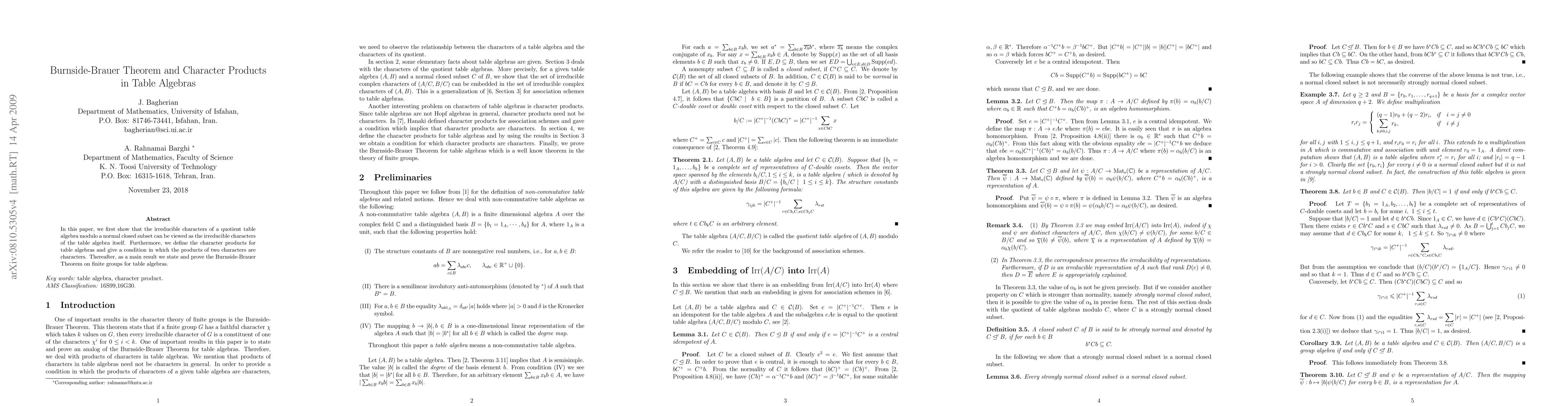 This paper demonstrates that the irreducible characters of a quotient table algebra remain the same as those of the original table algebra. It introduces character products for table algebras and establishes conditions under which these products yield another character. The paper concludes by proving the Burnside-Brauer Theorem for finite groups within the context of table algebras.