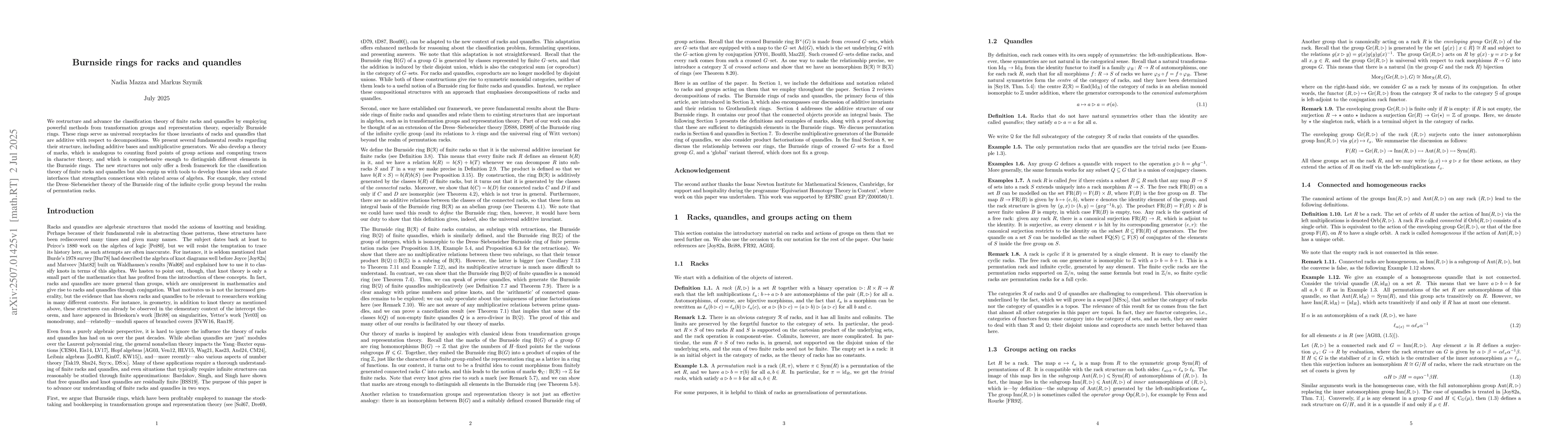 We restructure and advance the classification theory of finite racks and quandles by employing powerful methods from transformation groups and representation theory, especially Burnside rings. These rings serve as universal receptacles for those invariants of racks and quandles that are additive with respect to decompositions. We present several fundamental results regarding their structure, including additive bases and multiplicative generators. We also develop a theory of marks, which is analogous to counting fixed points of group actions and computing traces in character theory, and which is comprehensive enough to distinguish different elements in the Burnside rings. The new structures not only offer a fresh framework for the classification theory of finite racks and quandles but also equip us with tools to develop these ideas and create interfaces that strengthen connections with related areas of algebra. For example, they extend the Dress--Siebeneicher theory of the Burnside ring of the infinite cyclic group beyond the realm of permutation racks.