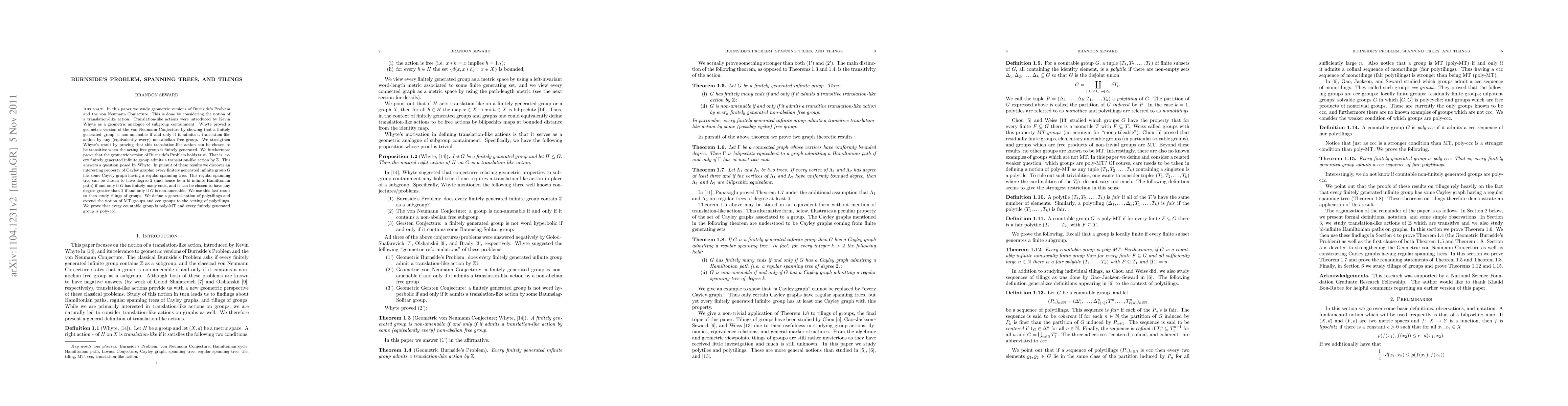 In this paper we study geometric versions of Burnside's Problem and the von Neumann Conjecture. This is done by considering the notion of a translation-like action. Translation-like actions were introduced by Kevin Whyte as a geometric analogue of subgroup containment. Whyte proved a geometric version of the von Neumann Conjecture by showing that a finitely generated group is non-amenable if and only if it admits a translation-like action by any (equivalently every) non-abelian free group. We strengthen Whyte's result by proving that this translation-like action can be chosen to be transitive when the acting free group is finitely generated. We furthermore prove that the geometric version of Burnside's Problem holds true. That is, every finitely generated infinite group admits a translation-like action by $\Z$. This answers a question posed by Whyte. In pursuit of these results we discover an interesting property of Cayley graphs: every finitely generated infinite group $G$ has some Cayley graph having a regular spanning tree. This regular spanning tree can be chosen to have degree 2 (and hence be a bi-infinite Hamiltonian path) if and only if $G$ has finitely many ends, and it can be chosen to have any degree greater than 2 if and only if $G$ is non-amenable. We use this last result to then study tilings of groups. We define a general notion of polytilings and extend the notion of MT groups and ccc groups to the setting of polytilings. We prove that every countable group is poly-MT and every finitely generated group is poly-ccc.