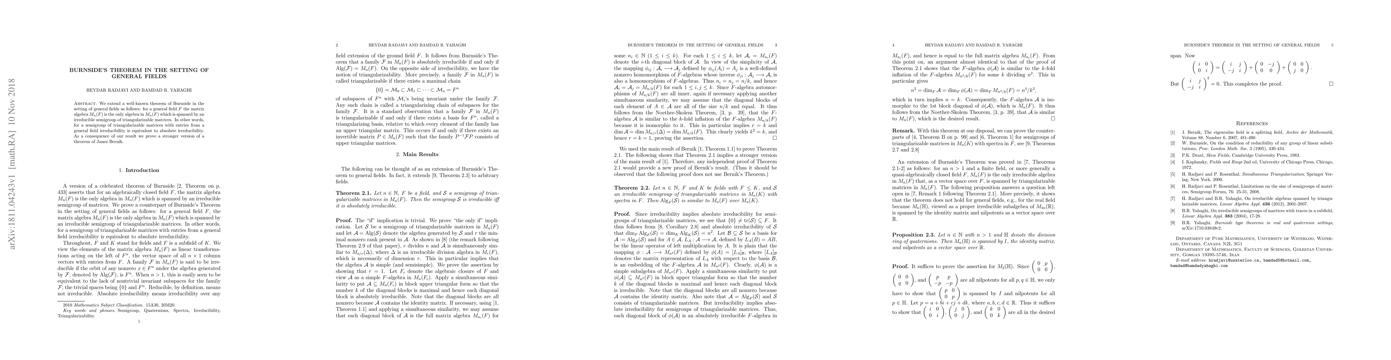 We extend a well-known theorem of Burnside in the setting of general fields as follows: for a general field $F$ the matrix algebra $M_n(F)$ is the only algebra in $M_n(F)$ which is spanned by an irreducible semigroup of triangularizable matrices. In other words, for a semigroup of triangularizable matrices with entries from a general field irreducibility is equivalent to absolute irreducibility. As a consequence of our result we prove a stronger version of a theorem of Janez Bernik.