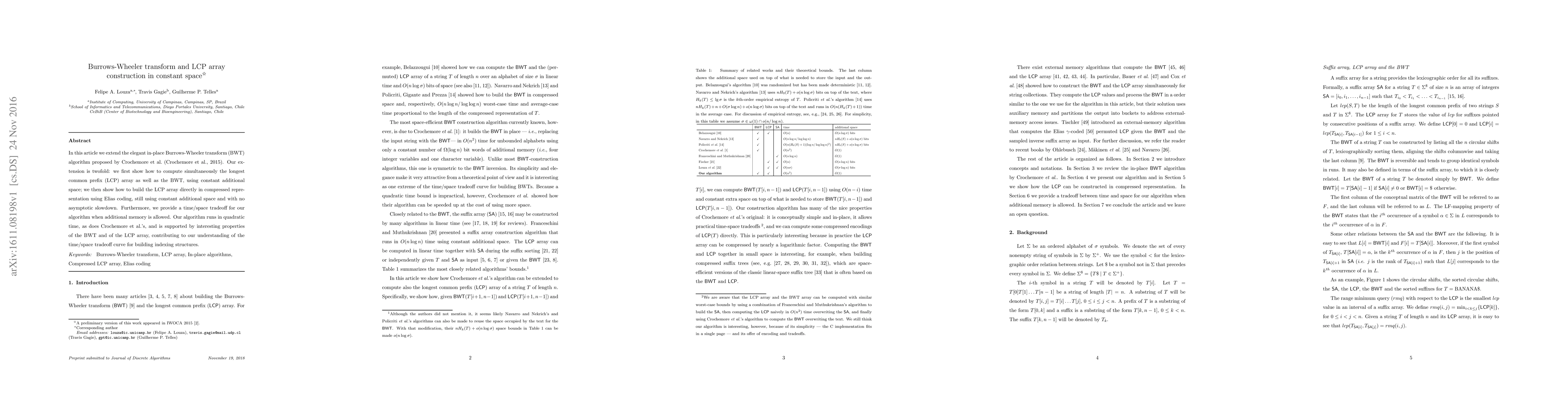 The paper presents an in-place algorithm for simultaneous BWT and LCP computation with constant additional space, and introduces a compressed LCP representation using Elias coding.