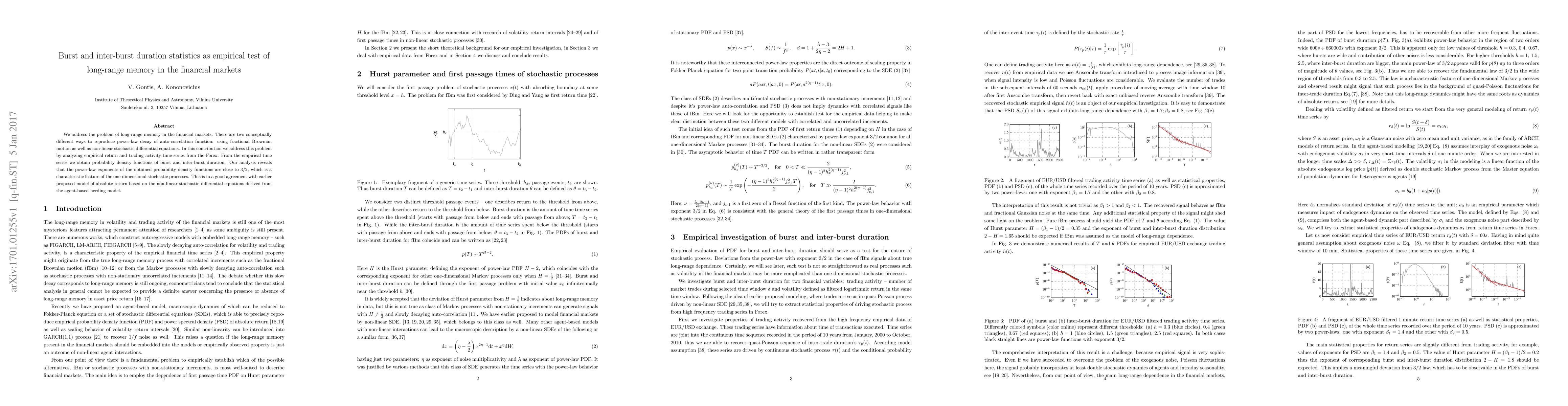 We address the problem of long-range memory in the financial markets. There are two conceptually different ways to reproduce power-law decay of auto-correlation function: using fractional Brownian motion as well as non-linear stochastic differential equations. In this contribution we address this problem by analyzing empirical return and trading activity time series from the Forex. From the empirical time series we obtain probability density functions of burst and inter-burst duration. Our analysis reveals that the power-law exponents of the obtained probability density functions are close to $3/2$, which is a characteristic feature of the one-dimensional stochastic processes. This is in a good agreement with earlier proposed model of absolute return based on the non-linear stochastic differential equations derived from the agent-based herding model.