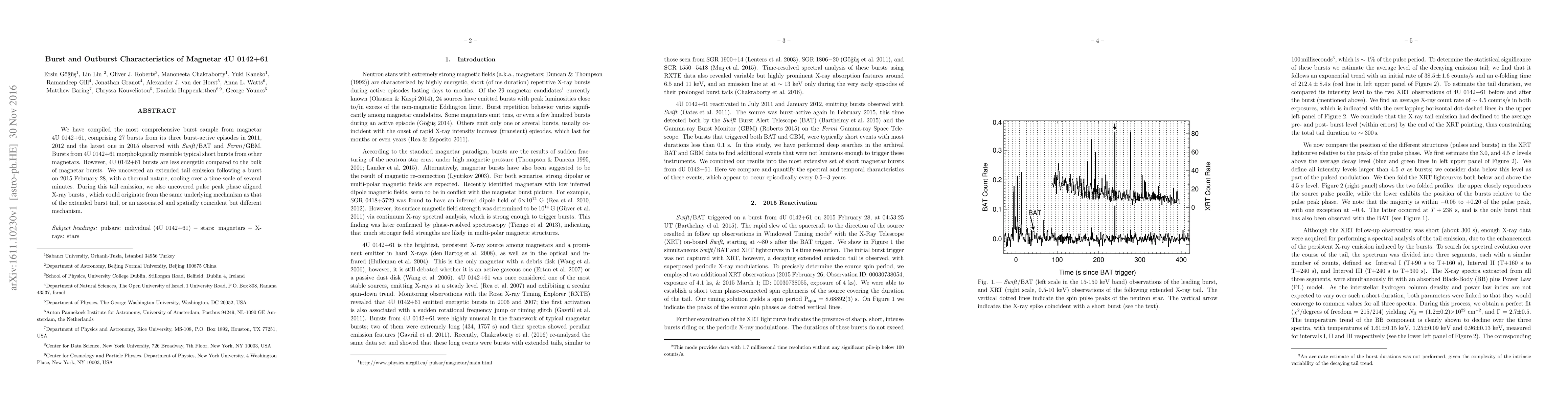 We have compiled the most comprehensive burst sample from magnetar 4U 0142+61, comprising 27 bursts from its three burst-active episodes in 2011, 2012 and the latest one in 2015 observed with Swift/BAT and Fermi/GBM. Bursts from 4U 0142+61 morphologically resemble typical short bursts from other magnetars. However, 4U 0142+61 bursts are less energetic compared to the bulk of magnetar bursts. We uncovered an extended tail emission following a burst on 2015 February 28, with a thermal nature, cooling over a time-scale of several minutes. During this tail emission, we also uncovered pulse peak phase aligned X-ray bursts , which could originate from the same underlying mechanism as that of the extended burst tail, or an associated and spatially coincident but different mechanism.