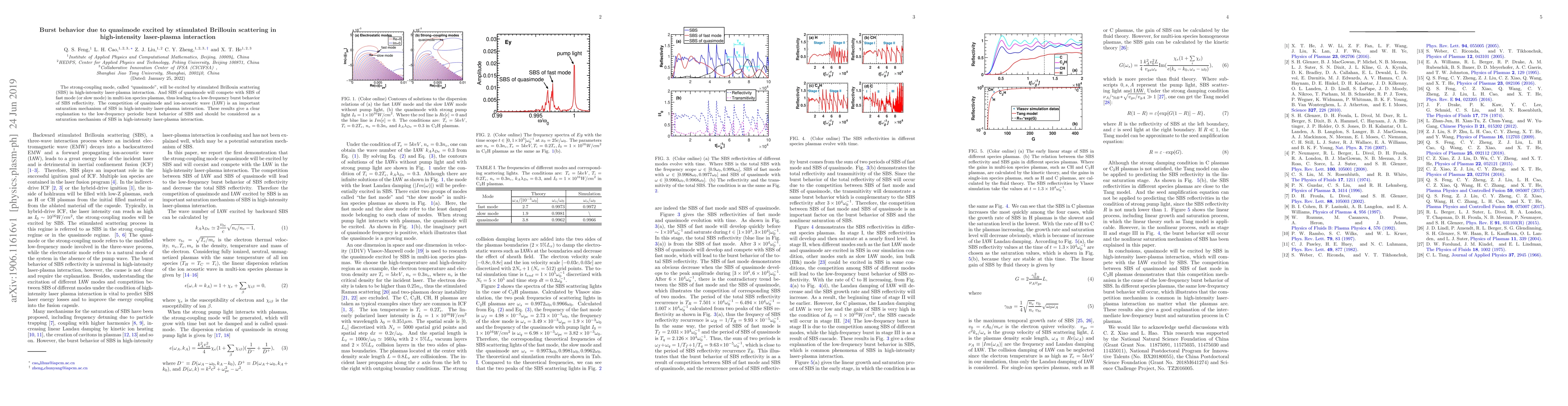 This paper investigates the excitation of quasimodes in high-intensity laser-plasma interactions via stimulated Brillouin scattering (SBS), revealing a low-frequency burst behavior due to competition between quasimode and fast/slow modes. The findings provide insight into the saturation mechanism of SBS in such interactions.