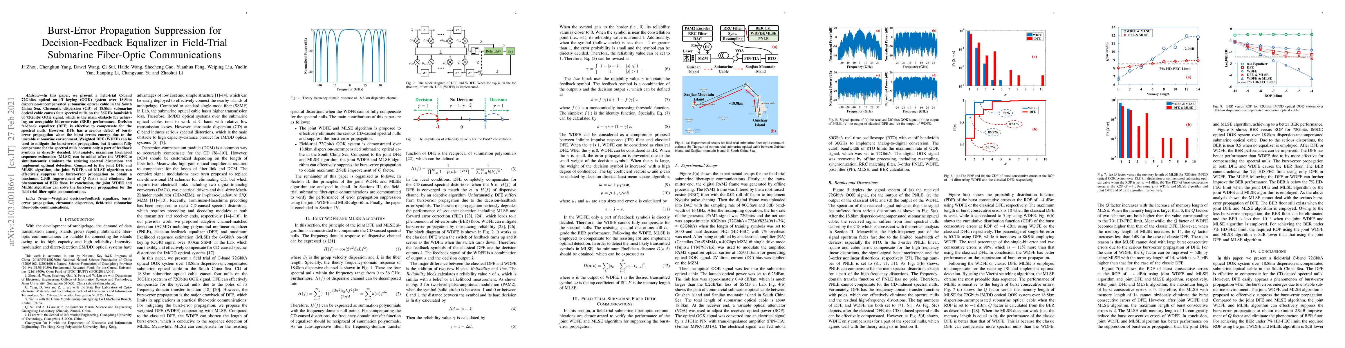 In this paper, we present a field-trial C-band 72Gbit/s optical on-off keying (OOK) system over 18.8km dispersion-uncompensated submarine optical cable in the South China Sea. Chromatic dispersion (CD) of 18.8km submarine optical cable causes four spectral nulls on the 36GHz bandwidth of 72Gbit/s OOK signal, which is the main obstacle for achieving an acceptable bit-error-rate (BER) performance. Decision feedback equalizer (DFE) is effective to compensate for the spectral nulls. However, DFE has a serious defect of burst-error propagation when the burst errors emerge due to the unstable submarine environment. Weighted DFE (WDFE) can be used to mitigate the burst-error propagation, but it cannot fully compensate for the spectral nulls because only a part of feedback symbols is directly decided. Fortunately, maximum likelihood sequence estimation (MLSE) can be added after the WDFE to simultaneously eliminate the resisting spectral distortions and implement optimal detection. Compared to the joint DFE and MLSE algorithm, the joint WDFE and MLSE algorithm can effectively suppress the burst-error propagation to obtain a maximum 2.9dB improvement of $\boldsymbol{Q}$ factor and eliminate the phenomenon of BER floor. In conclusion, the joint WDFE and MLSE algorithm can solve the burst-error propagation for the field-trial fiber-optic communications.